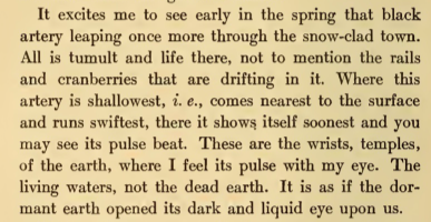 where the old man thinks he may possibly afford to rust it out, not having long to live, but the young man pines to get nearer the post-office and the Lyceum, is restless and resolves to go to California, because the depot is a mile off (he hears the rattle of the cars at a distance and thinks the world is going by and leaving him); where rabbits and partridges multiply, and muskrats are more numerous than ever, and none of the farmer’s sons are willing to be farmers, and the apple trees are decayed, and the cellar-holes are more numerous than the houses, and the rails are covered with lichens, and the old maids wish to sell out and move into the village, and have waited twenty years in vain for this purpose and never finished but one room in the house, never plastered nor painted, inside or out, lands which the Indian was long since dispossessed [of], and now the farms are run out, and what were forests are grain-fields, what were grain-fields, pastures; dwellings which only those Arnolds of the wilderness, those coureurs de bois, the baker and the butcher visit, to which at least the latter penetrates for the annual calf, — and as he returns the cow lows after, — whither the villager never penetrates, but in huckleberry time, perchance, and if he does not, who does? — where some men’s breaths smell of rum, having smuggled in a jugful to alleviate their misery and solitude; where the owls give a regular serenade; — I say, standing there and seeing these things, I cannot realize that this is that hopeful young America which is famous throughout the world for its activity and enterprise, and this is the most thickly settled and Yankee part of it.