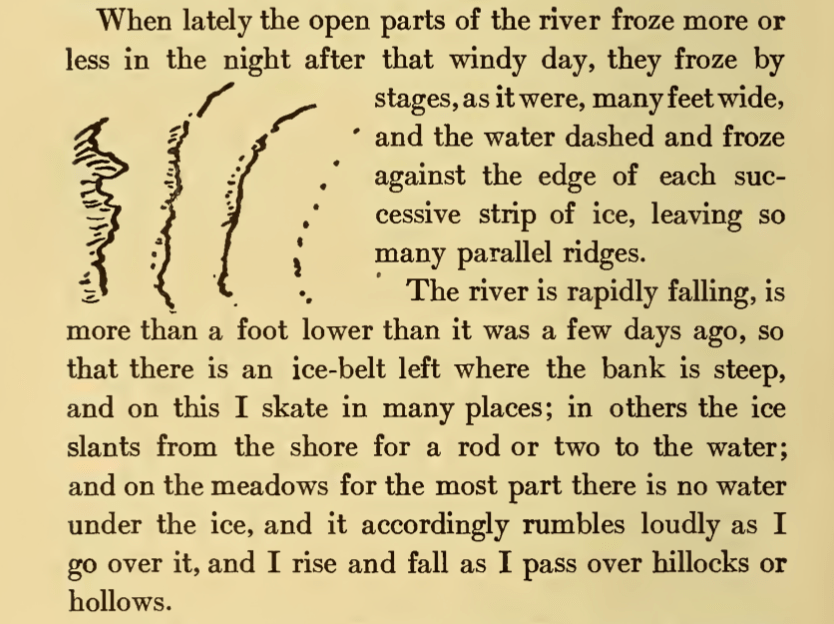When lately the open parts of the river froze more or less in the night after that windy day, they froze by stages, as it were, many feet wide, and the water dashed and froze against the edge of each successive strip of ice, leaving so many parallel ridges.