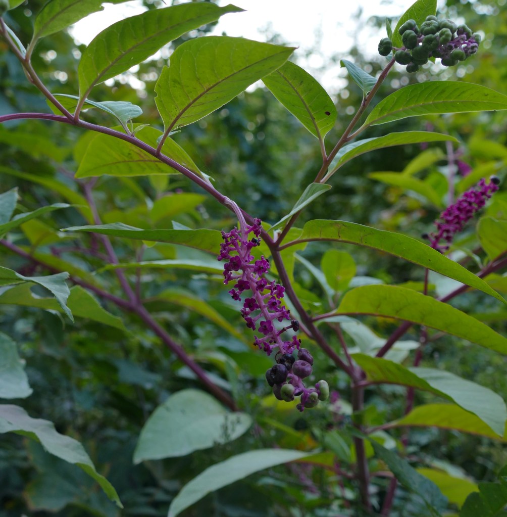 P. M. – To old mill-site behind Ponkawtasset. Poke berries in the sprout-land east of the red huckleberry still fresh and abundant, perhaps a little past prime. I never saw so many. The plants stand close together, and their drooping racemes three to five inches long, of black or purplish-black berries (ending in red and less [an indecipherable word]), almost crowd one another, hanging around the bright-purple, now for the most part bare, stems.