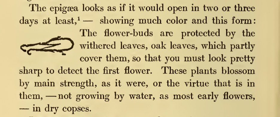 The epigaea is not quite out. The earliest peculiarly woodland herbaceous flowers are epigaea, thalictrum, and (by the first of May) Viola pedata. These grow quite in the woods amid dry leaves, nor do they depend so much on water as the very earliest flowers. I am perhaps more surprised by the growth of the Viola pedata leaves by the side of paths amid the shrub oaks, and half covered with oak leaves, than by any other growth, the situation is so dry and the surrounding bushes so apparently lifeless.