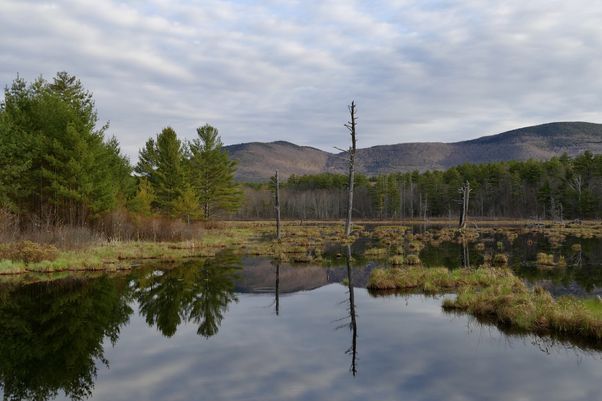 Looking from the Cliff, now, about 6 a. m., the landscape is as if seen in a mirage, the Cliff being in shadow, and that in the fresh and dewy sunshine (not much dew yet). Cool sunlight. The landscape lies in a fresh morning light; the earth and water smell fresh and new; the water is marked by a few smooth streaks. The atmosphere suits the grayish-brown landscape, — the still ashy maple swamps and now nearly bare shrub oaks. The white pine, left here and there over the sprout-land, is never more beautiful than with the morning light ––the early sunlight and the dew ––on it. (Dew comes with grass? and for it?) Before the water is rippled and morning song of the birds is quenched.