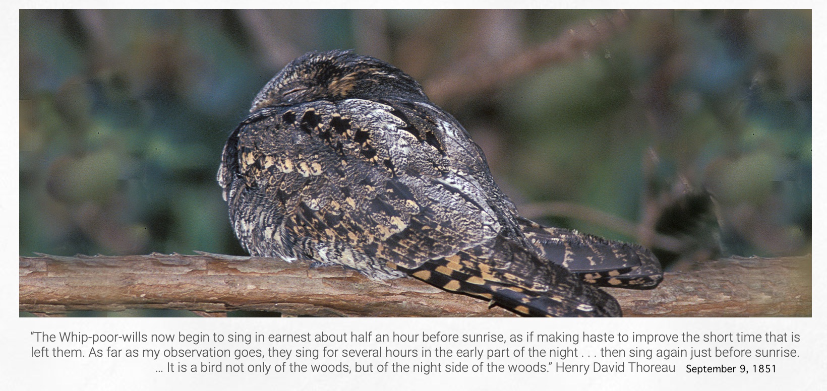 The whip-poor-will suggests how wide asunder the woods and the town. Its note is very rarely heard by those who live on the street, ‘and then it is thought to be of ill omen. Only the dwellers on the outskirts of the village hear it occasionally. It sometimes comes into their yards. But go into the woods in a warm night at this season, and it is the prevailing sound. I hear now five or six at once. It is no more of ill omen therefore here than the night and the moonlight are. It is a bird not only of the woods, but of the night side of the woods.