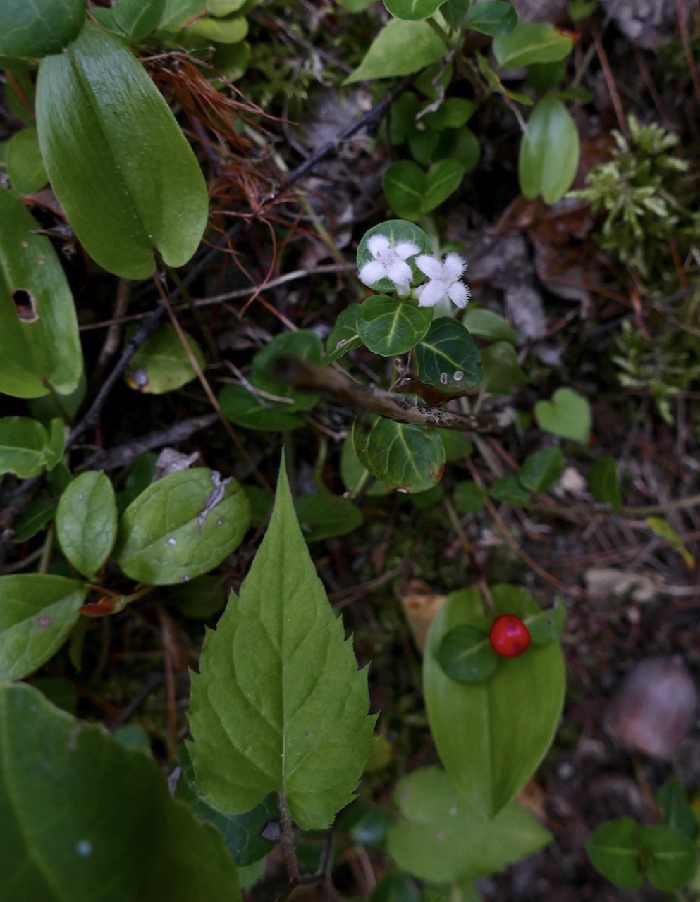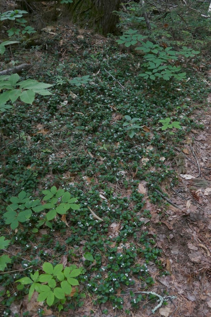 The Mitchella repens, so abundant now in the north-west part of Hubbard’s Grove, emits a strong astringent cherry-like scent as I walk over it, now that it is so abundantly in bloom, which is agreeable to me, —spotting the ground with its downy-looking white flowers.