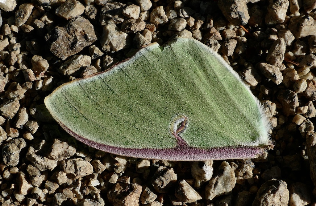 Under the Salix nigra var. falcata, [black willow] near that handsomest one, which now is full of scythe-shaped leaves, the larger six inches long by seven eighths wide, with remarkably broad lunar leafy appendages or stipules at their base, I found a remarkable moth lying flat on the still water as if asleep (they appear to sleep during the day), as large as the smaller birds. Five and a half inches in alar extent and about three inches long, something like the smaller figure in one position of the wings (with a remarkably narrow lunar-cut tail), of a sea-green color, with four conspicuous spots whitish within, then a red line, then yellowish border below or toward the tail, but brown, brown orange, and black above, toward head; a very robust body, covered with a kind of downy plumage, an inch and a quarter long by five eighths thick.