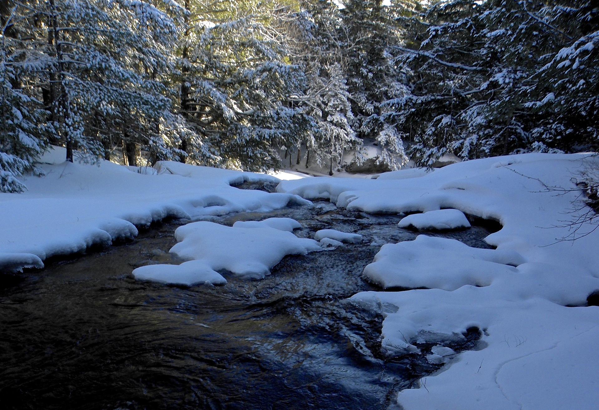 We walk dry-shod the day after a rain which raises the river three feet. I am struck by the dark blue of the agitated river.