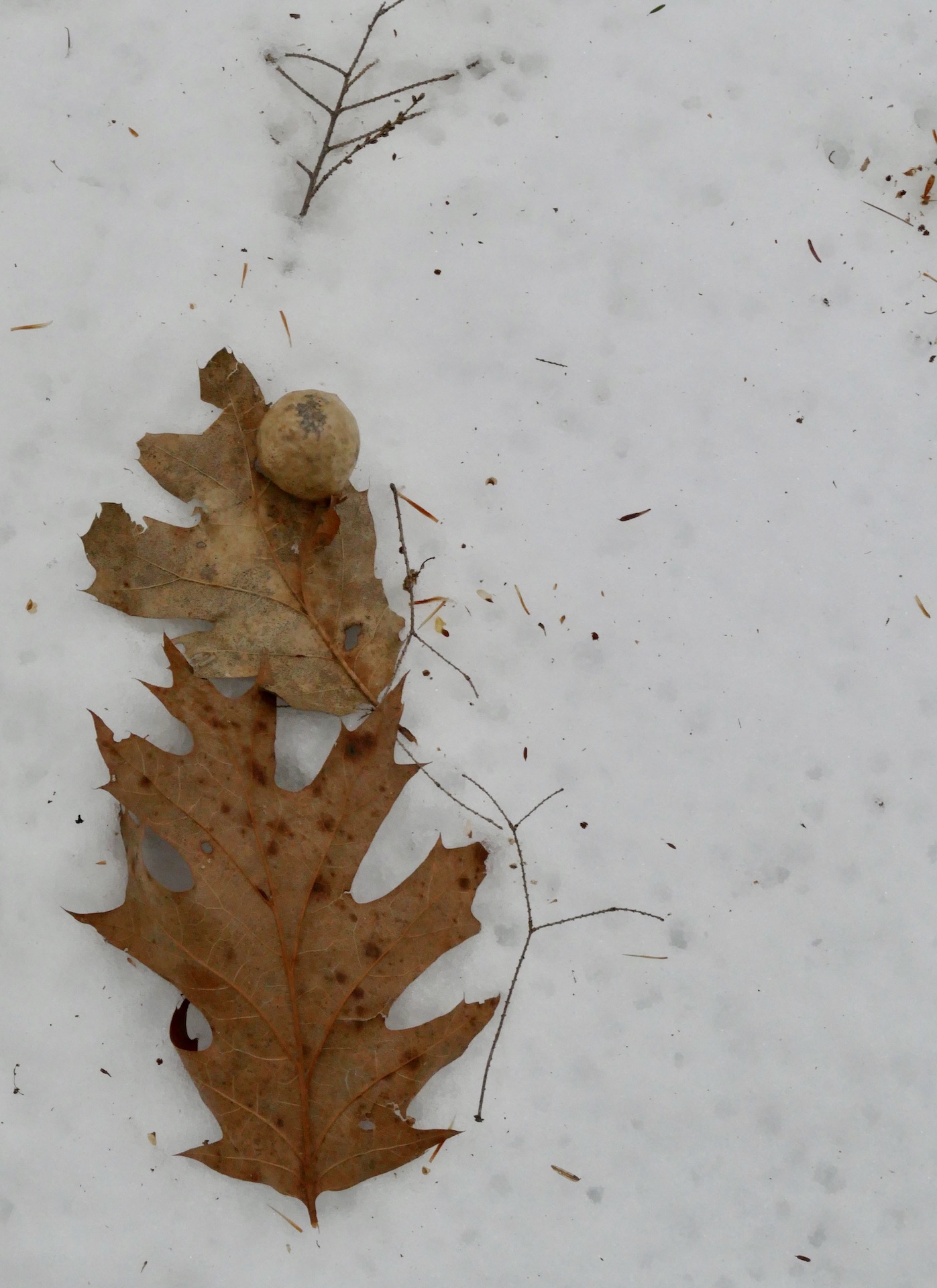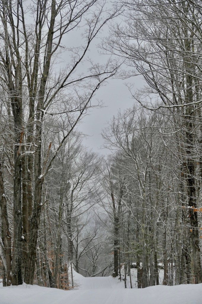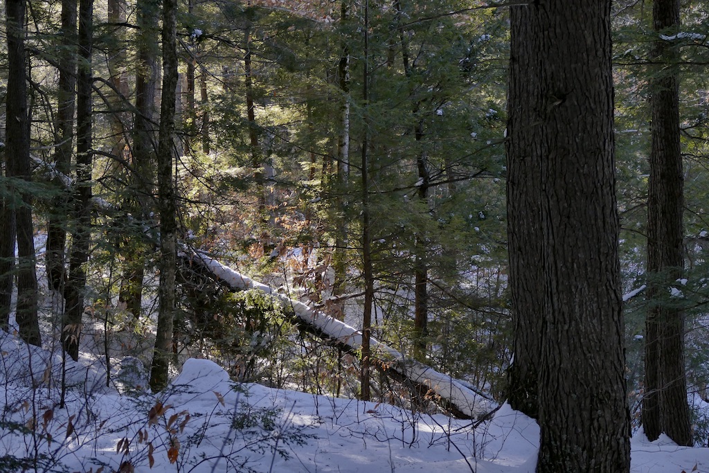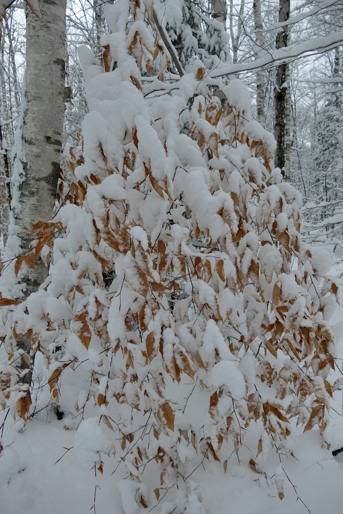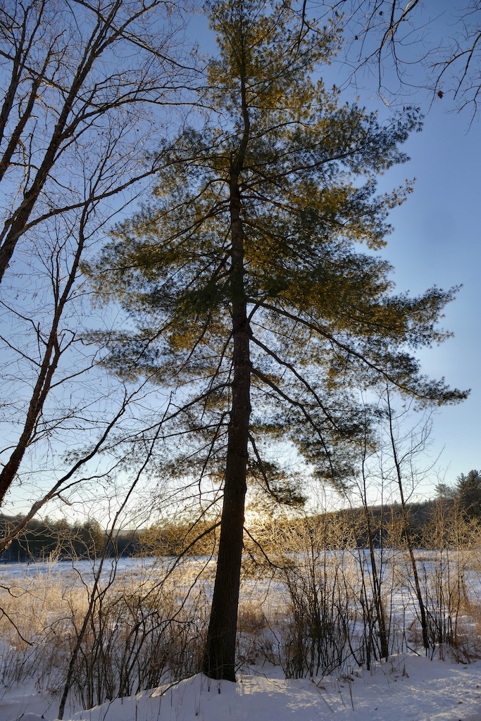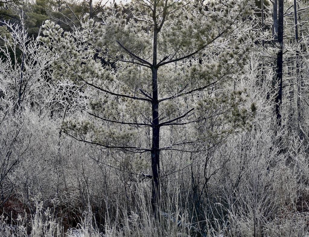 In particular places standing on their snowiest side the woods were incredibly fair—white as alabaster—indeed the young pines reminded you of the purest statuary. & the stately full grown ones towering around affected you as if you stood in a Titanic sculptor’s studio. So purely & delicately white—transmitting the light—their dark trunks all concealed. And in many places where the snow lay on withered oak leaves between you & the light—various delicate fawn coloured & cinnamon tints blending with the white still enhanced the beauty.