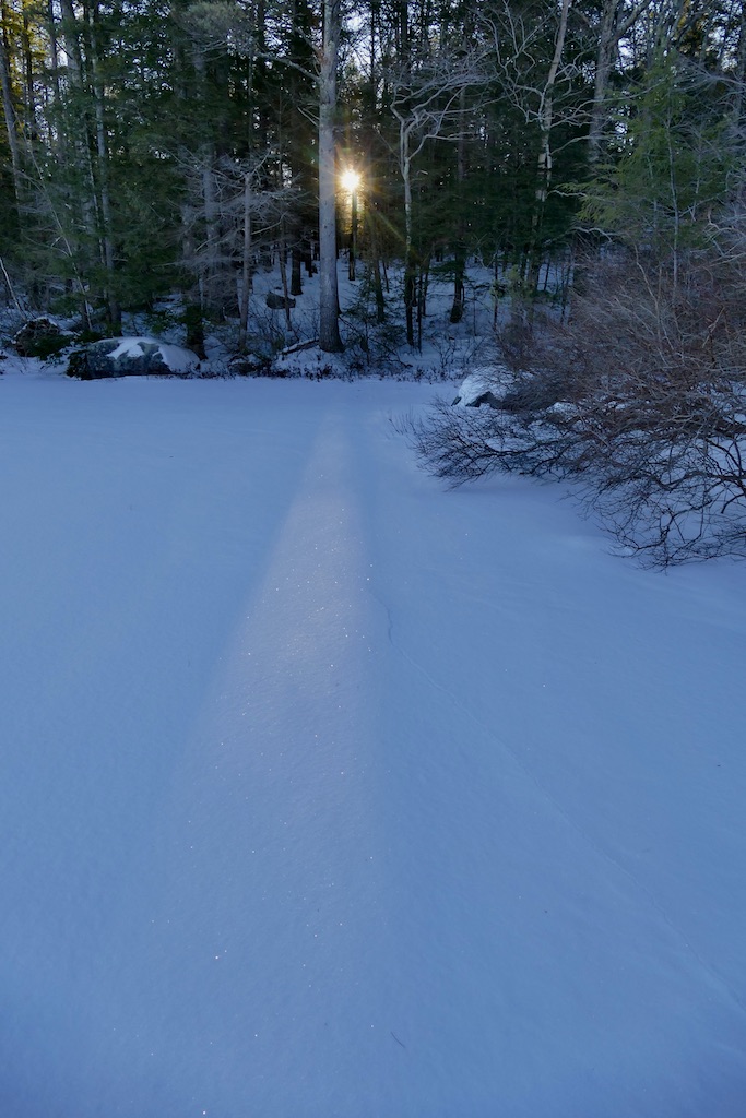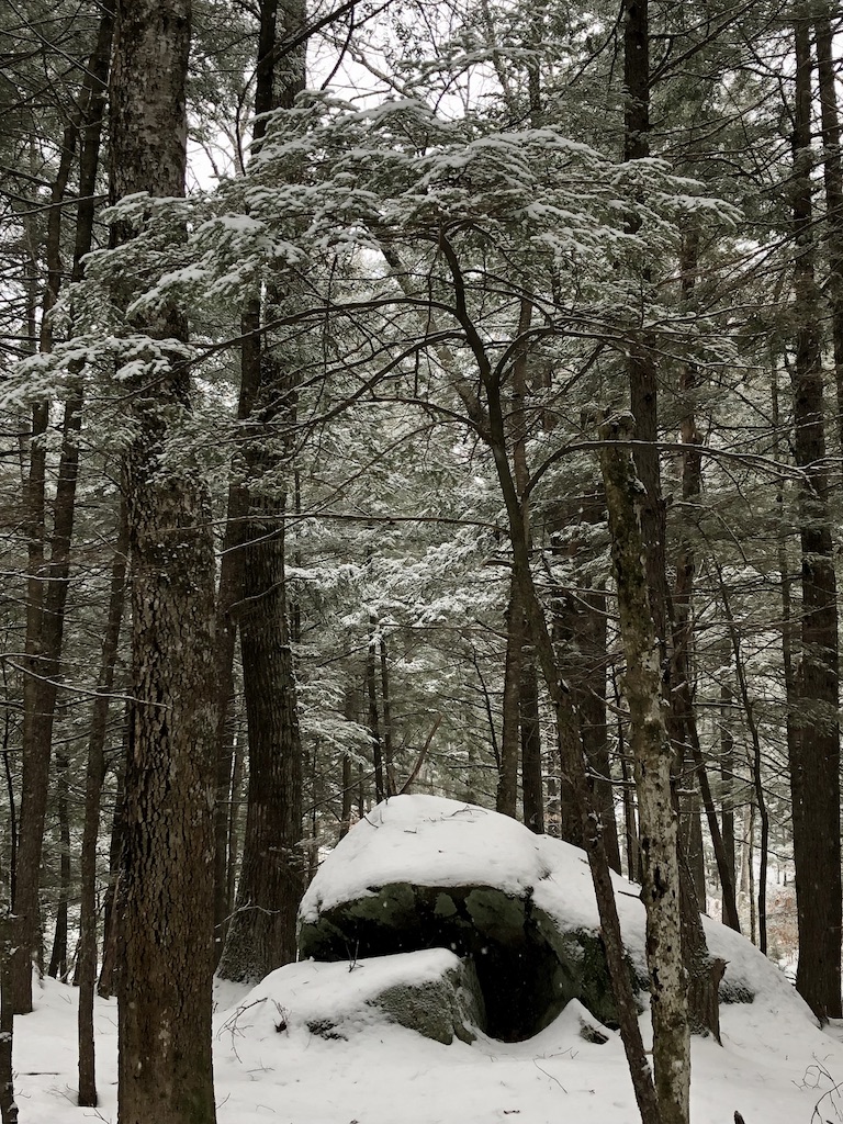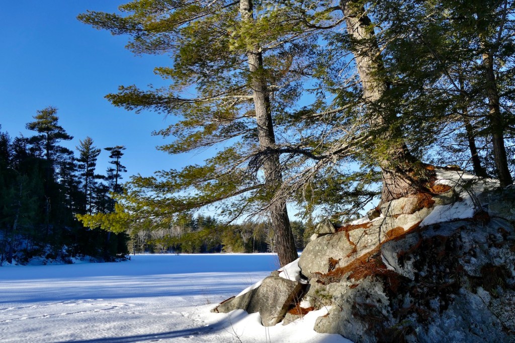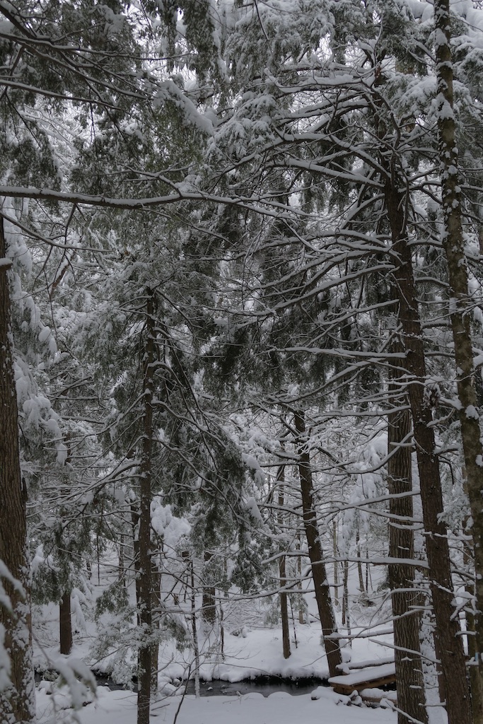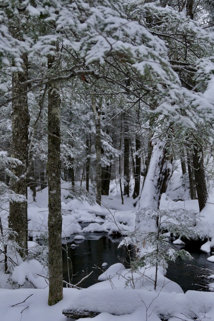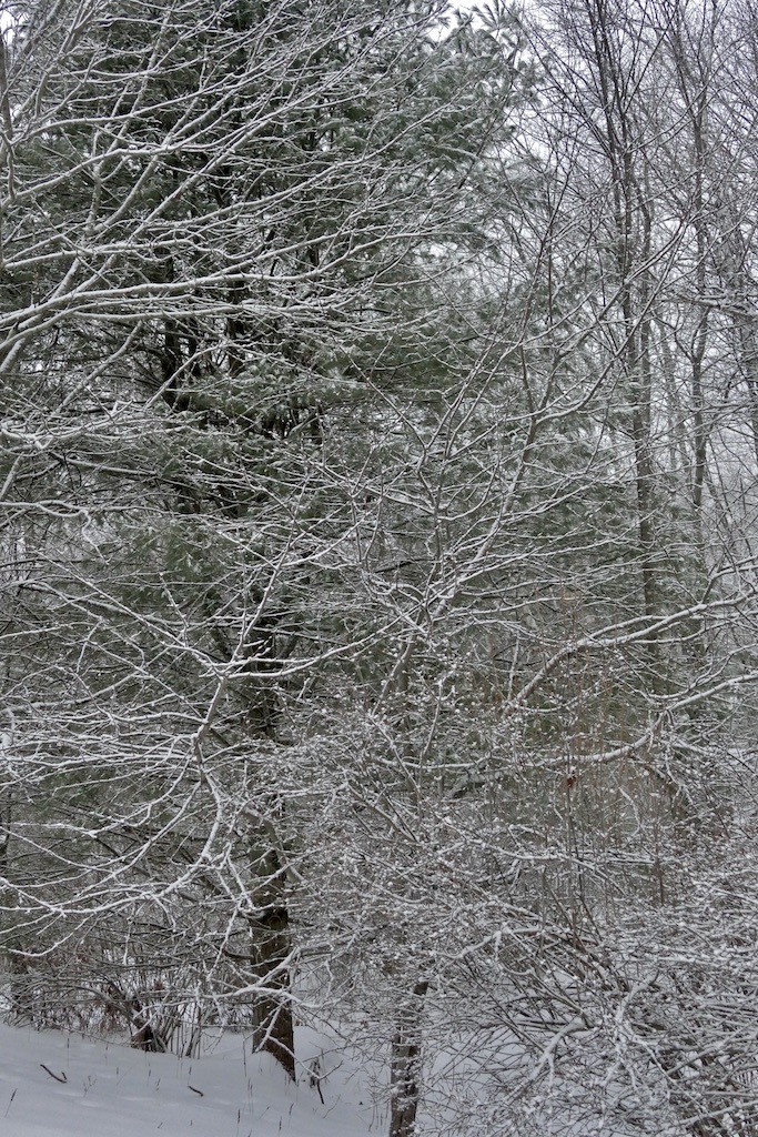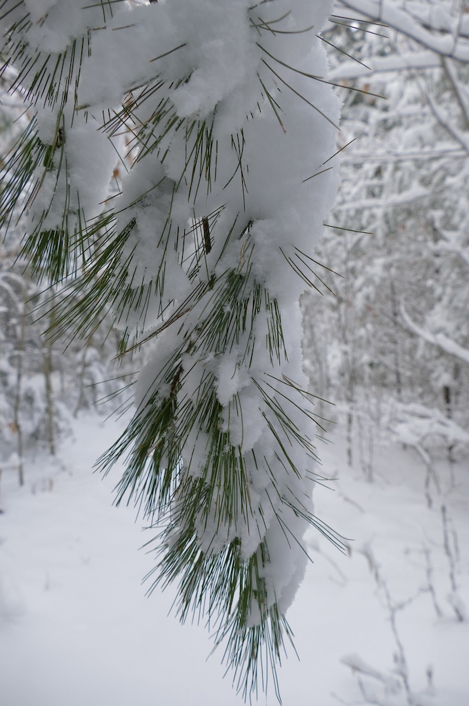 How new all things seem! Here is a broad, shallow pool in the fields which yesterday was slush, now converted into a soft, white fleecy snow ice…It is like the beginning of the world. There is nothing hackneyed where a new snow can come and cover all the landscape…The world is not only new to the eye, but is still as at creation. Every blade and leaf is hushed, not a bird or insect is heard, only, perchance, a faint tinkling sleigh-bell in the distance…The snow still adheres conspicuously to the N.W. sides of the stems of the trees, quite up to their summits, with a remarkably sharp edge in that direction…It would be about as good as a compass to steer by in a cloudy day or by night…I doubt if I can convey an idea of the appearance of the woods yesterday. As you stood in their midst, and looked round on their boughs and twigs laden with snow, it seemed as if there could be none left to reach the ground. These countless zigzag white arms crossing each other at every possible angle completely closed up the view like a light drift within three or four rods on every side, the wintriest prospect imaginable. That snow which sifted down into the wood paths was much drier and lighter than elsewhere.
