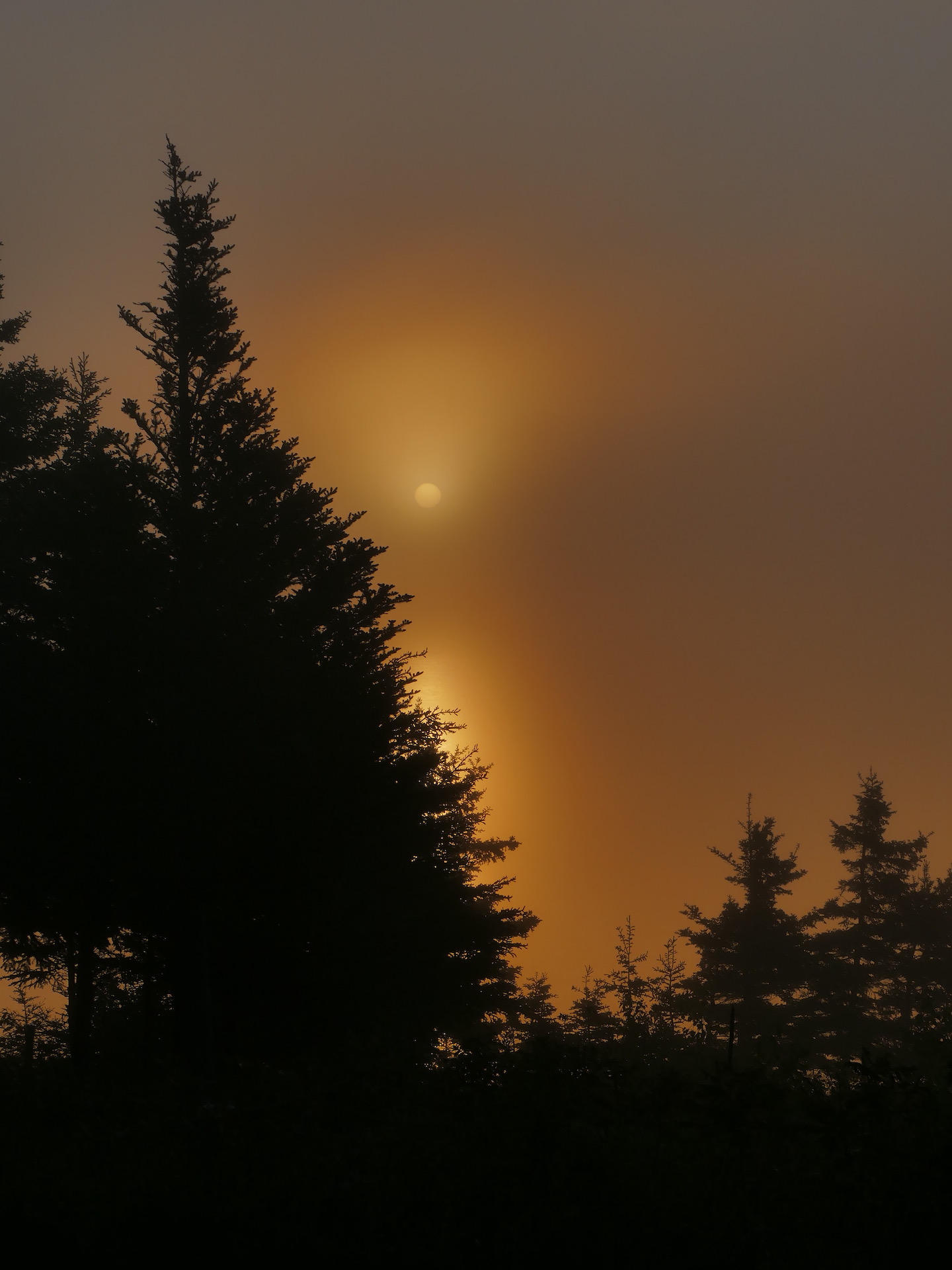 Sunrise, —merely a segment of a circle of rich amber in the east, growing brighter and brighter at one point. There is no rosy color at this moment and not a speck in the sky, and now comes the sun with out pomp, a bright liquid gold. Dews come with the grass. There is, I find on examining, a small, clear drop at the end of each blade, quite at the top on one side.