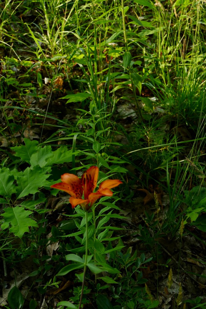 Red lilies in prime, single upright fiery flowers, their throats how splendidly and variously spotted, hardly two of quite the same hue and not two spotted alike––leopard-spotted––averaging a foot or more in height amide the huckleberry and lamb kill, etc, in the moist, meadowy pasture.