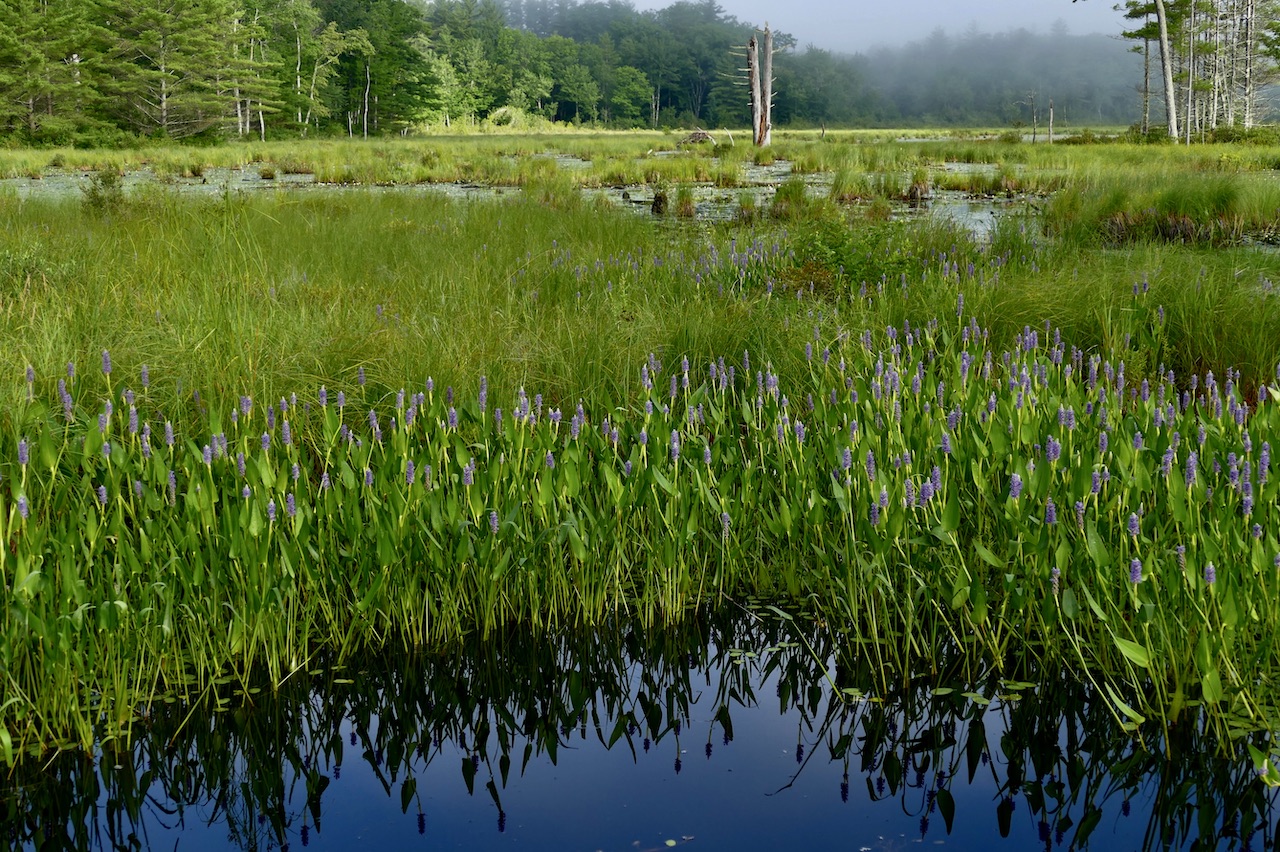 We are gliding swiftly up the river by Lee’s bend. The surface of the water is the place to see the Pontederia from for now the spikes of flowers are all brought into a dense line––a heavy line of blue a foot or more in width––on both sides of the river. The pontederias are now in their prime––there being no withered heads, they are very freshly blue. In the sun when you are looking west they are of a violaceous blue….In many parts of the river the pickerel weed is several rods wide––its blueness akin to the misty blue air which paints the sky….The border of pontederia is rarely of equal depth on both sides at once––but it keeps that side in the meander where the sediment is deposited––the shortest course which will follow the shore…..This is the longest line of blue that nature paints with flowers in our fields––though the lupines may have been more densely blue within a small compass–– Thus by a natural law a river instead of flowing straight through its meadows––meanders––from side to side––& fertilizes this side or that & adorns its banks with flowers.