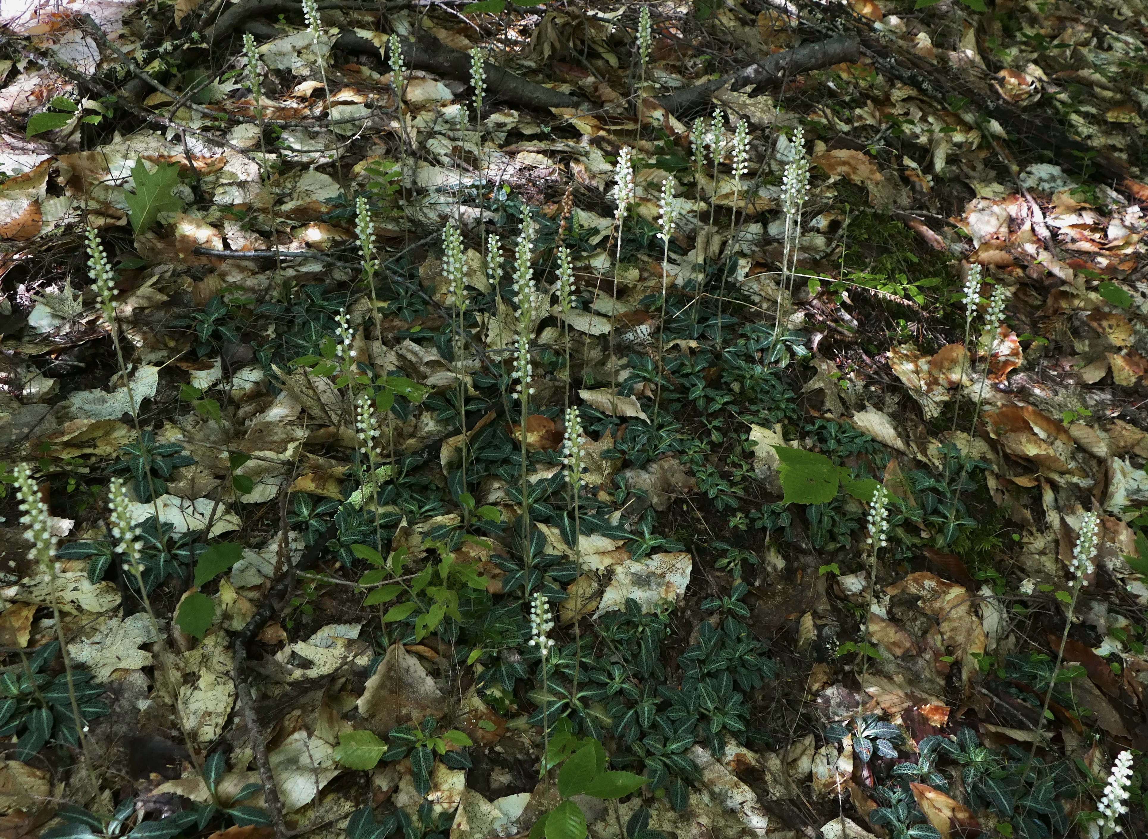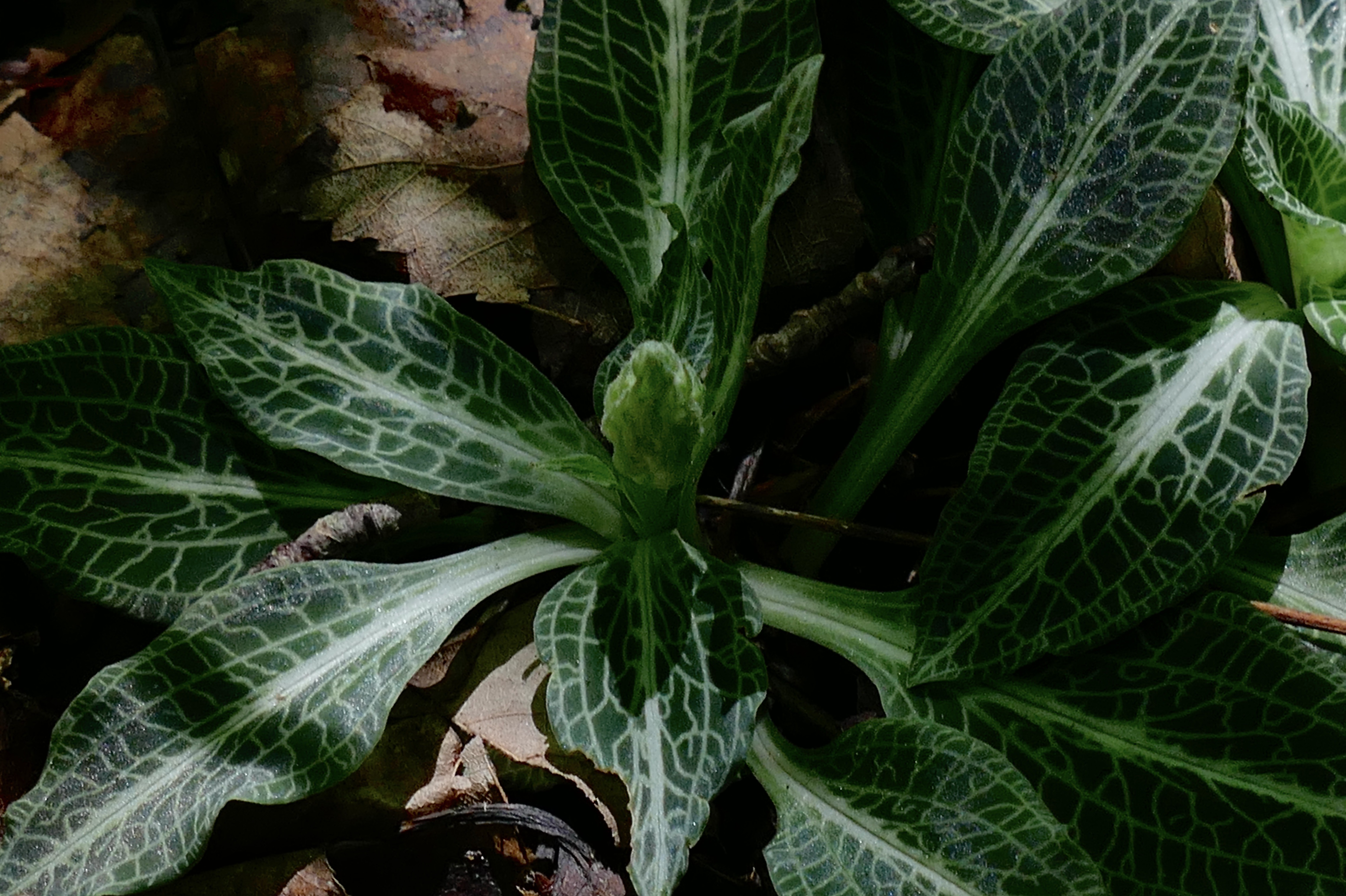 Goodyera Pubescens–Rattle-snake Plantain is ap. a little past its prime– It is very abundant on Clintonia swamp hill-side quite erect with its white spike 8 to 10 inches high on the sloping hillside the lower half or more turning brown–but the beautifully reticulated leaves which pave the moist shady hill-side about its base are the chief attraction. These oval leaves perfectly smooth like velvet to the touch about 1 1/2 inches long–have a broad longitudinal white white mid-rib & 4 to 6 white parallel veins very prettily & thickly connected by other conspicuous white veins transversely—& irregularly—all on a dark rich green ground.