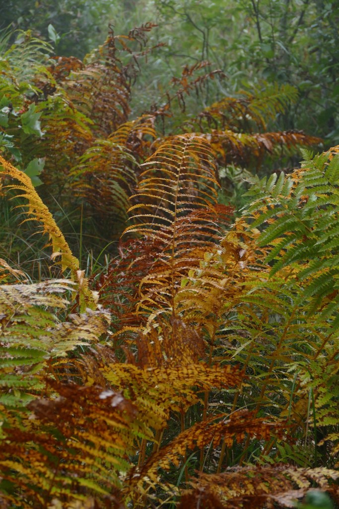 The change decay & fall of the brakes in woods &c is perhaps more autumnal that any sight–– They make more show than the aralia. Some are quite brown & shriveled––others––yellow––others yellow & brown––others yellow, brown, & green––making a very rich & particolored or checkered work as of plaited straw-bead or straw work––or ivory–– Others are still green with brown spots. In respect to these and many other plants of this size & habitat it is already fall. They stand yellow & yellowing all through the woods–– None perhaps so conspicuous as the brake–– At thrush alley was surprised to behold how many birch leaves had turned yellow––every other one––while clear fresh leather colored ones strewed the ground with a pretty thick bed under each tree–– So far as the birches go it is a perfect autumnal scene there––