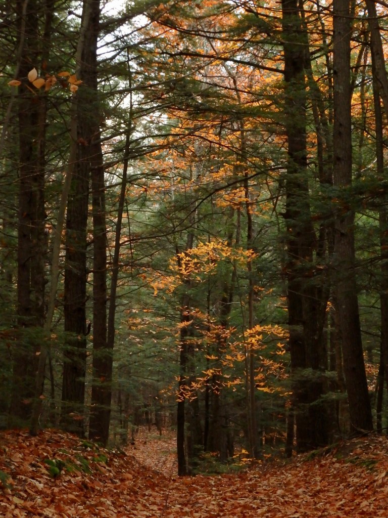 The road through the woods this side the powder mill was very gorgeous with the sun shining endwise through it—& the red tints of the deciduous trees now somewhat imbrowned—mingled with the liquid green of the pines.