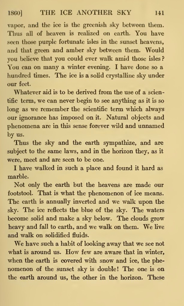 As it is important to consider nature from the point of view of science—remembering the nomenclature and systems of men—& so if possible go a step further in that direction—so it is equally important often to ignore or forget all that men presume that they know—& take an original and unprejudiced view of Nature—letting her make what impression she will on you—as the first men & all children & natural men do.
