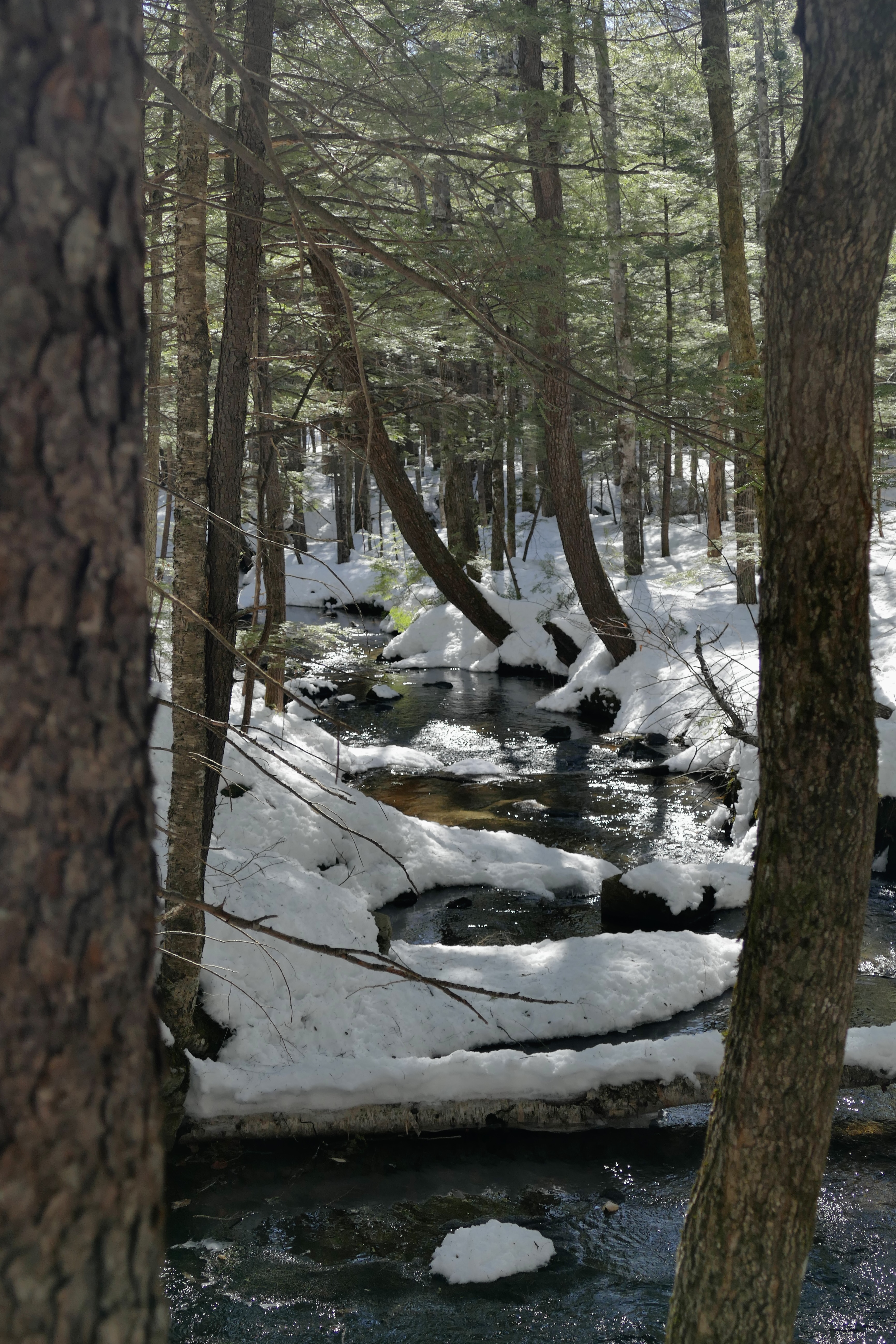 Sat awhile before sunset on the rocks in Saw Mill Brook. A brook need not be large to afford us pleasure by its sands and meanderings and falls and their various accompaniments. It is not so much size that we want as picturesque beauty and harmony. If the sound of its fall fills my ear it is enough. I require that the rocks over which it falls be agreeably disposed, and prefer that they be covered with lichens. The height and volume of the fall is of very little importance compared with the appearance and disposition of the rocks over which it falls, the agreeable diversity of still water, rapids, and falls, and of the surrounding scenery. I require that the banks and neighboring hillsides be not cut off, but excite a sense of at least graceful wildness. One or two small evergreens, especially hemlocks, standing gracefully on the brink of the rill, contrasting by their green with the surrounding deciduous trees when they have lost their leaves, and thus enlivening the scene and betraying their attachment to the water. It would be no more pleasing to me if the stream were a mile wide and the hemlocks five feet in diameter. I believe that there is a harmony between the hemlock and the water which it overhangs not explainable. In the first place, its green is especially grateful to the eye the greater part of the year in any locality, and in the winter, by its verdure overhanging and shading the water, it concentrates in itself the beauty of all fluviatile trees. It loves to stand with its foot close to the water, its roots running over the rocks of the shore, and two or more on opposite sides of a brook make the most beautiful frame to a waterscape, especially in deciduous woods, where the light is sombre and not too glaring. It makes the more complete frame because its branches, particularly in young specimens such as I am thinking of, spring from so near the ground, and it makes so dense a mass of verdure. There are many larger hemlocks covering the steep sidehill forming the bank of the Assabet, where they are successively undermined by the water, and they lean at every angle over the water. Some are almost horizontally directed, and almost every year one falls in and is washed away. The place is known as the ” Leaning Hemlocks.”