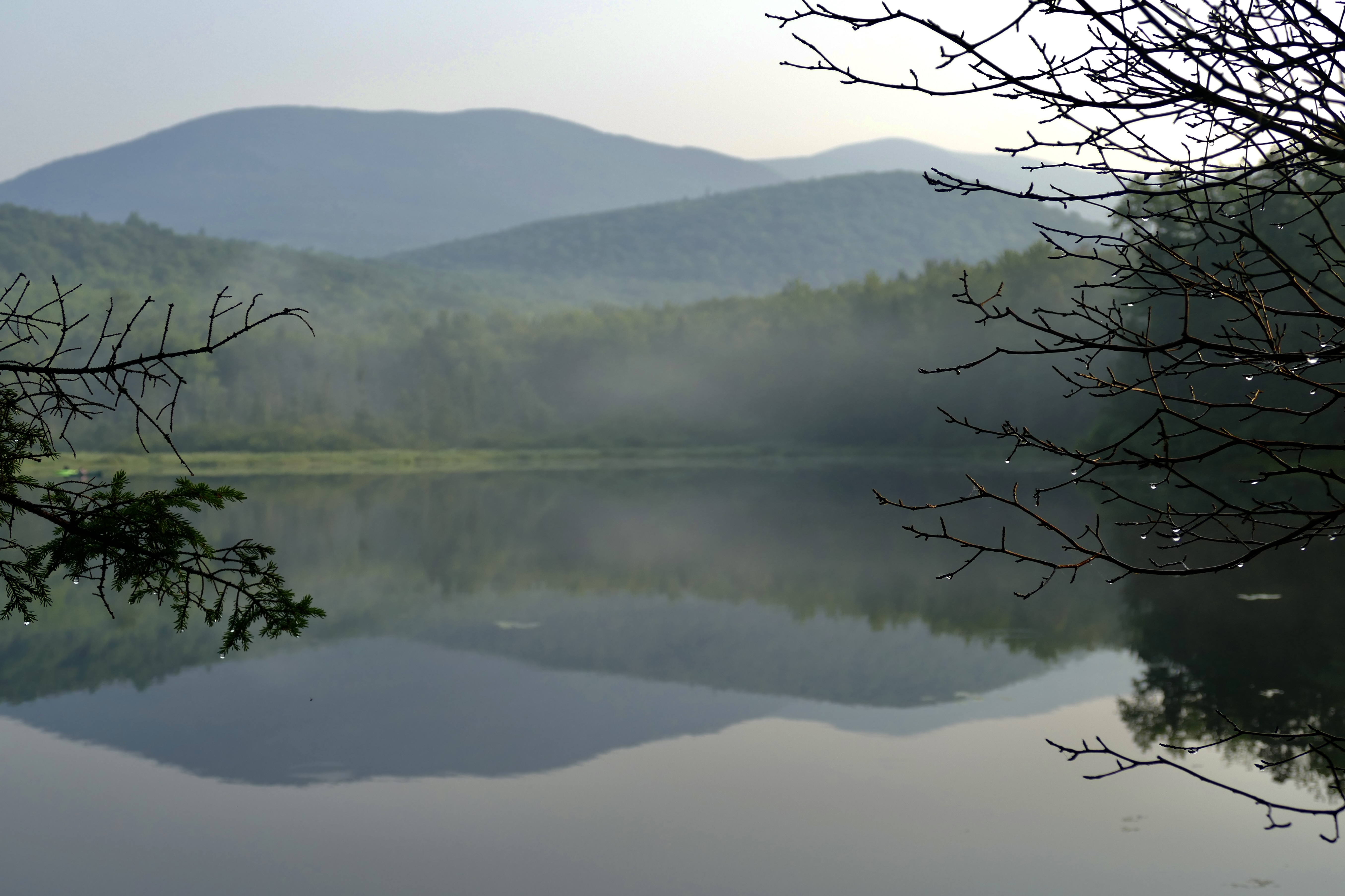 This is the gray morning––the sun risen–– a very thin mist on the landscape––the falling water smooth– Far below a screaming jay seen flying against the bare stems of the pines. The young oaks on the plain the pines stand here and there–the walls in Conantum pastures seen in the sun the little groves on the opposite side of the river lit up by it while I am shade–these are memorable & belong to the hour.
