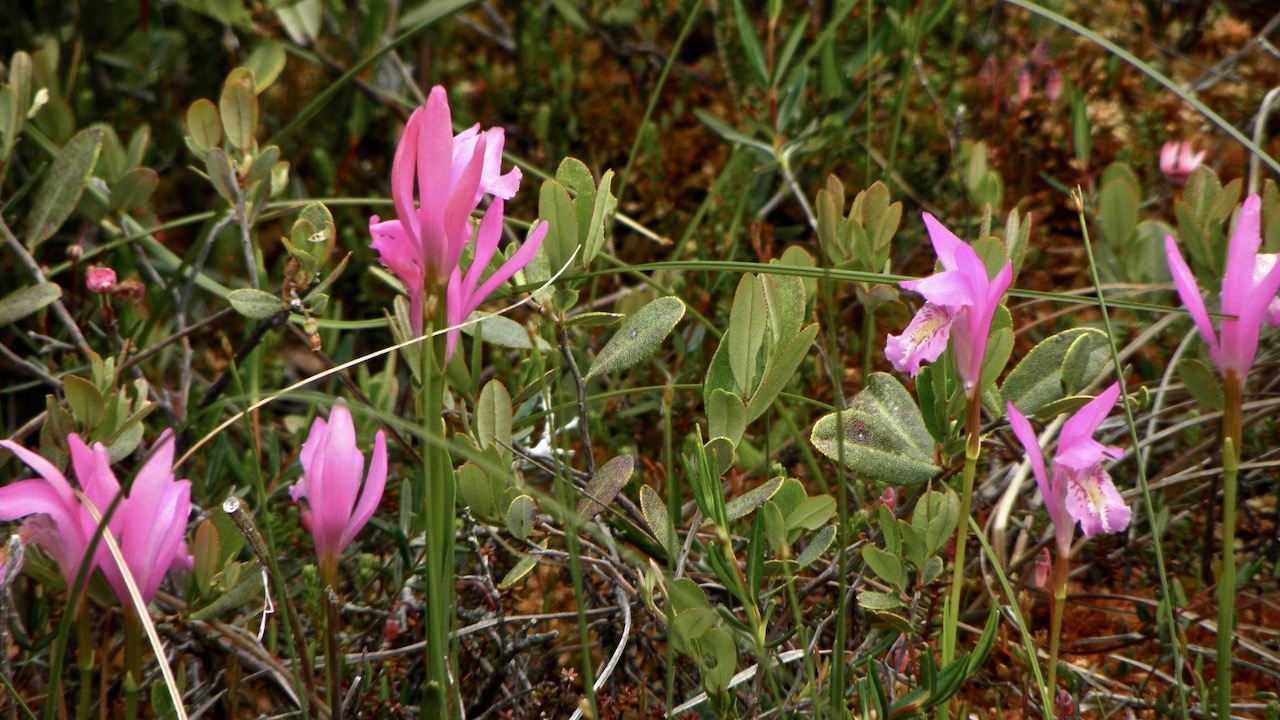 I am surprised to find arethusa abundantly out in Hubbards Close, maybe 2 or 3 days though not yet at Arethusa Meadow probably on account of the recent freshet. It is so leafless that it shoots up unexpectedly. It is all color, a little hook of purple flame projecting from the meadow into the air. Some are comparatively pale. This high-colored plant shoots up suddenly, all flower, in meadows where it is wet walking. A superb flower.