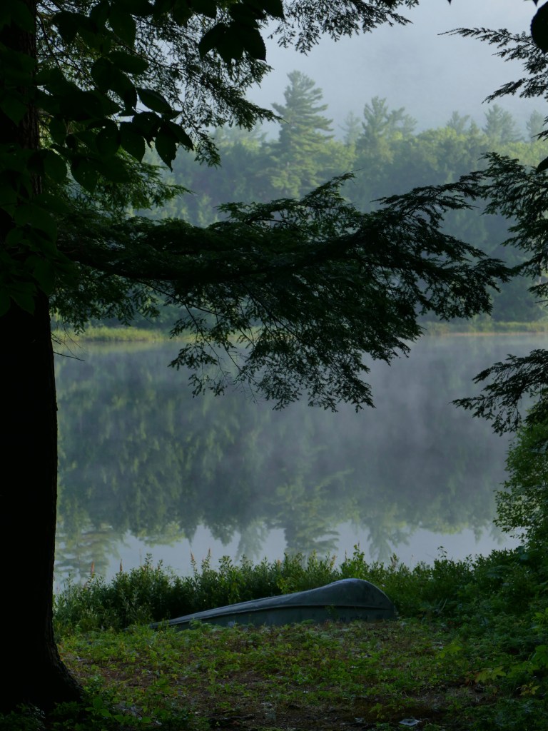 As I look out through the woods westward there, I see, sleeping and gleaming through the stagnant, misty, glaucous dog-day air, i. e. blue mist, the smooth silvery surface of Fair Haven Pond. There is a singular charm about it in this setting.