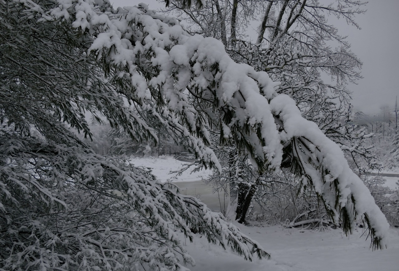 The snow hangs on the trees as the fruit of the season. In those twigs which the wind has preserved naked, there is a warmer green for the contrast. The whole tree exhibits a kind of interior and household comfort—a sheltered and covert aspect— It has the snug inviting look of a cottage on the Moors, buried in snows.