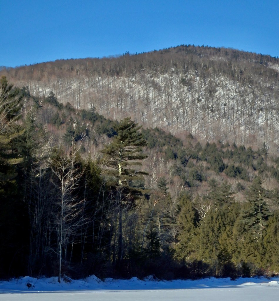 Standing in the middle of Walden I see with perfect distinctness the form & outlines of the low hills which surround it though they are wooded because they are quite white, being covered with snow– While the woods are for the most part bare or very thin leaved. I see thus the outline of the hills 8 or 10 rods back through the trees–This I can never do in the summer when the leaves are thick & the ground is nearly the same color with them. These white hills are now seen as through a veil of stems….The perfect winter days are cold but clear & bright.