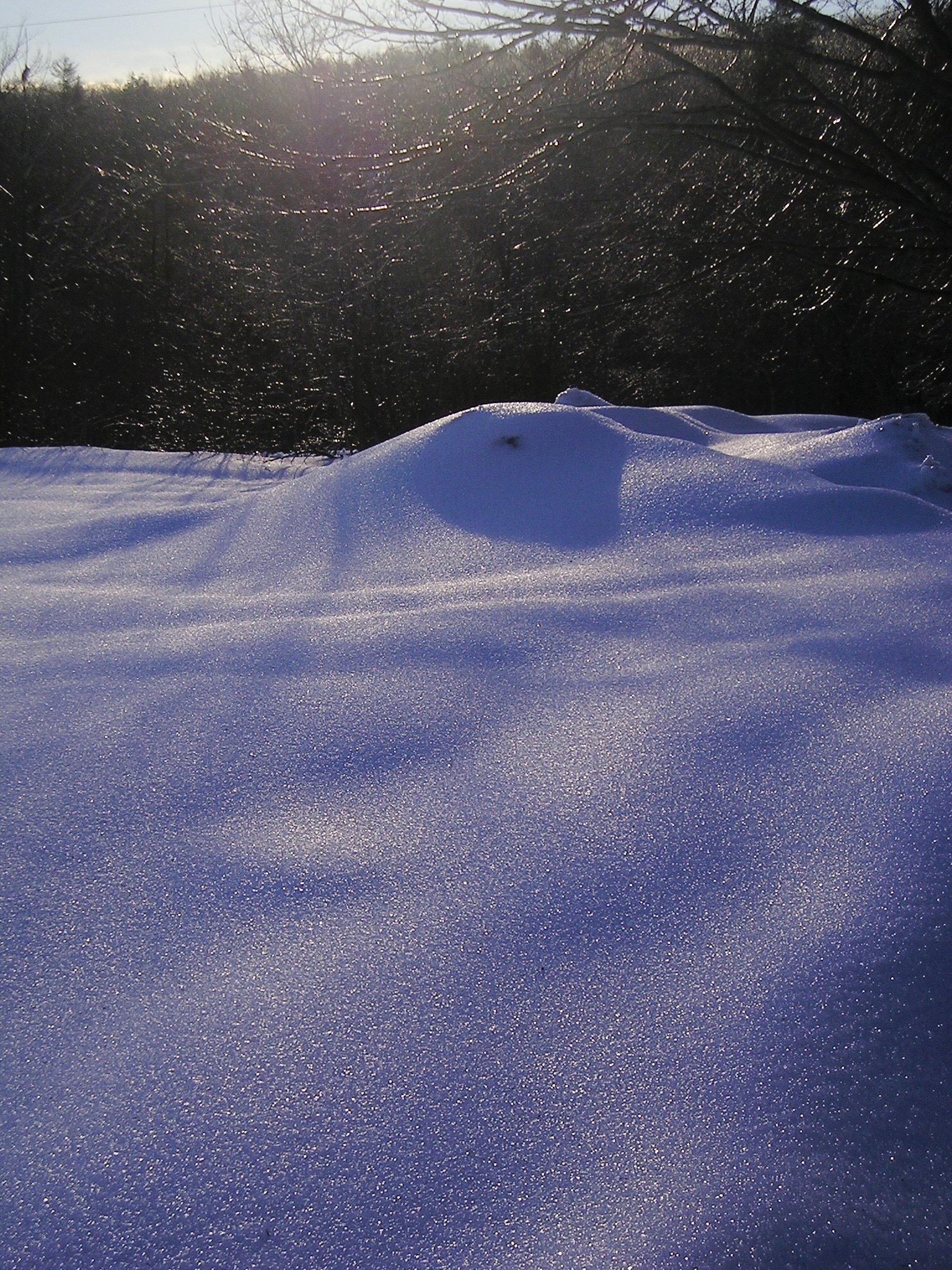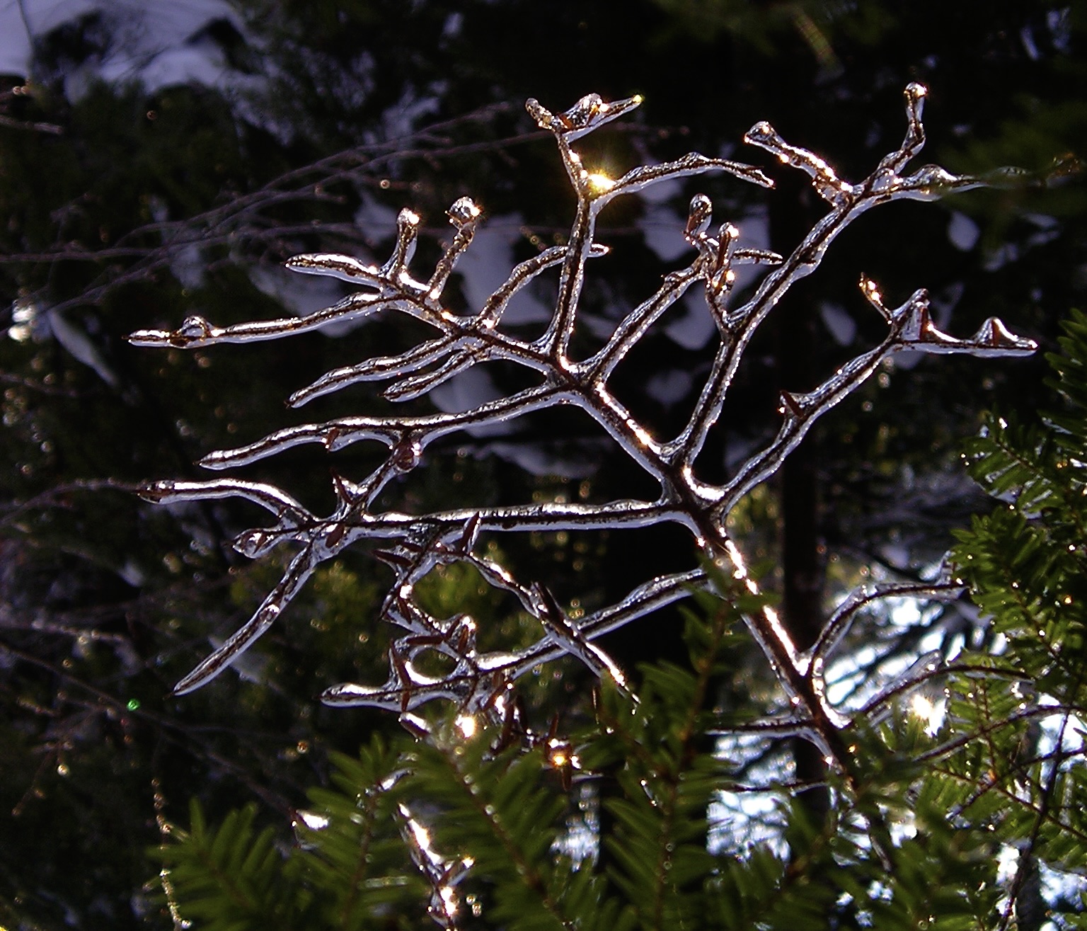 For two or three weeks, successive light and dry snows have fallen on the old crust and been drifting about on it, leaving it at last three quarters bare and forming drifts against the fences, etc., or here and there low, slaty, fractured ones in mid-field, or pure white hard-packed ones. These drifts on the crust are commonly quite low and flat. But yesterday’s snow turning to rain, which froze as it fell, there is now a glaze on the trees, giving them a hoary look, icicles like rakes’ teeth on the rails, and a thin crust over all the snow.