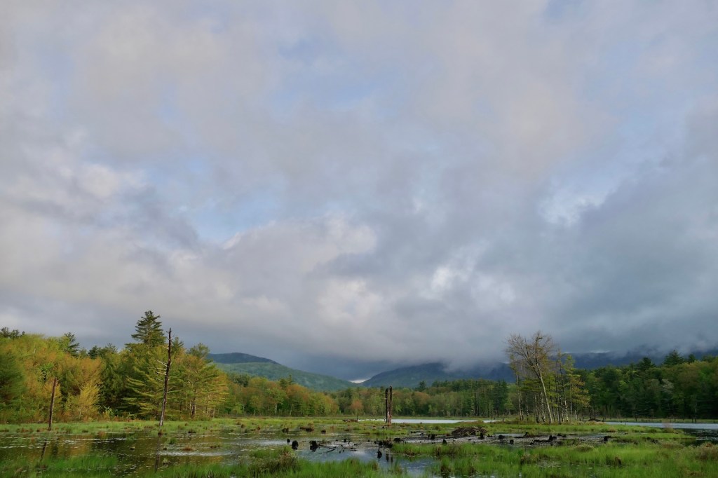 A warm, drizzling day, the tender yellow leafets now generally conspicuous, and contrasted with the almost black evergreens which they have begun to invest. The foliage is never more conspicuously a tender yellow than now. This lasts a week from this date, and then begins to be confounded with the older green. We have had rain for three or four days, and hence the tender foliage is the more yellow.