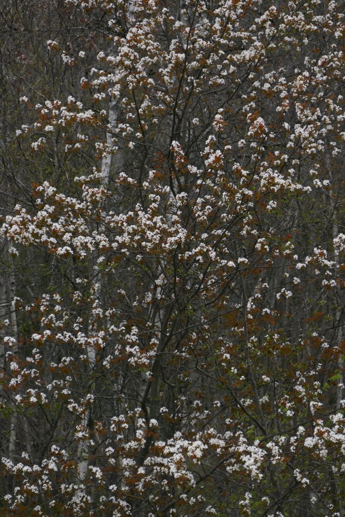 The shad-bush in bloom is now conspicuous, its white flags on all sides. Is it not the most massy and conspicuous of any wild plant now in bloom ? I see where the farmer mending his fence has just cut one to make part of the fence, and it is stretched out horizontally, a mass of white bloom.