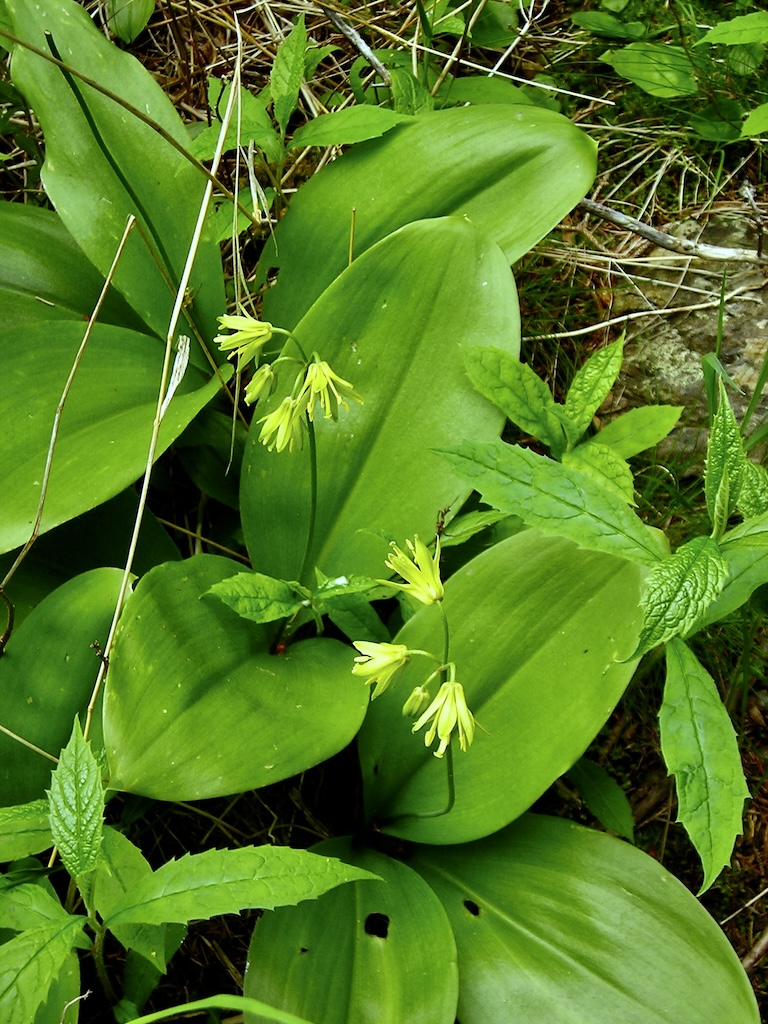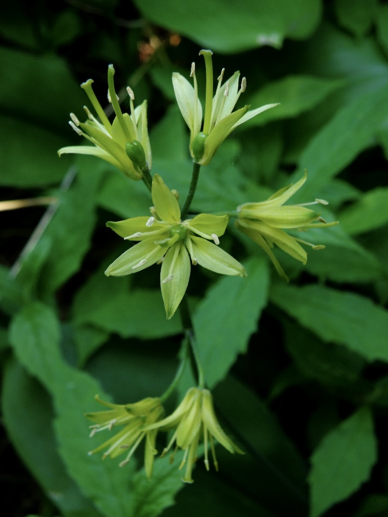 Clintonia Borealis a day or two….This is perhaps the most interesting & neatest of what I may call the liliaceous? plants we have–– Its beauty at present consists chiefly in its commonly 3 very handsome rich clear dark green leaves….They are perfect in form & color––broadly oblanceolate with a deep channel down the middle––uninjured by insects––arching over from a center at the ground sometimes very symmetrically disposed in a triangular fashion––& from their midst arises a scape a foot high with one or more umbels of “green bell—shaped flowers”––: yellowish green nodding or bent downward––but without fragrance–– In fact the flower is all green both leaves & corolla–– The leaves alone––& many have no scape––would detain the walker.
