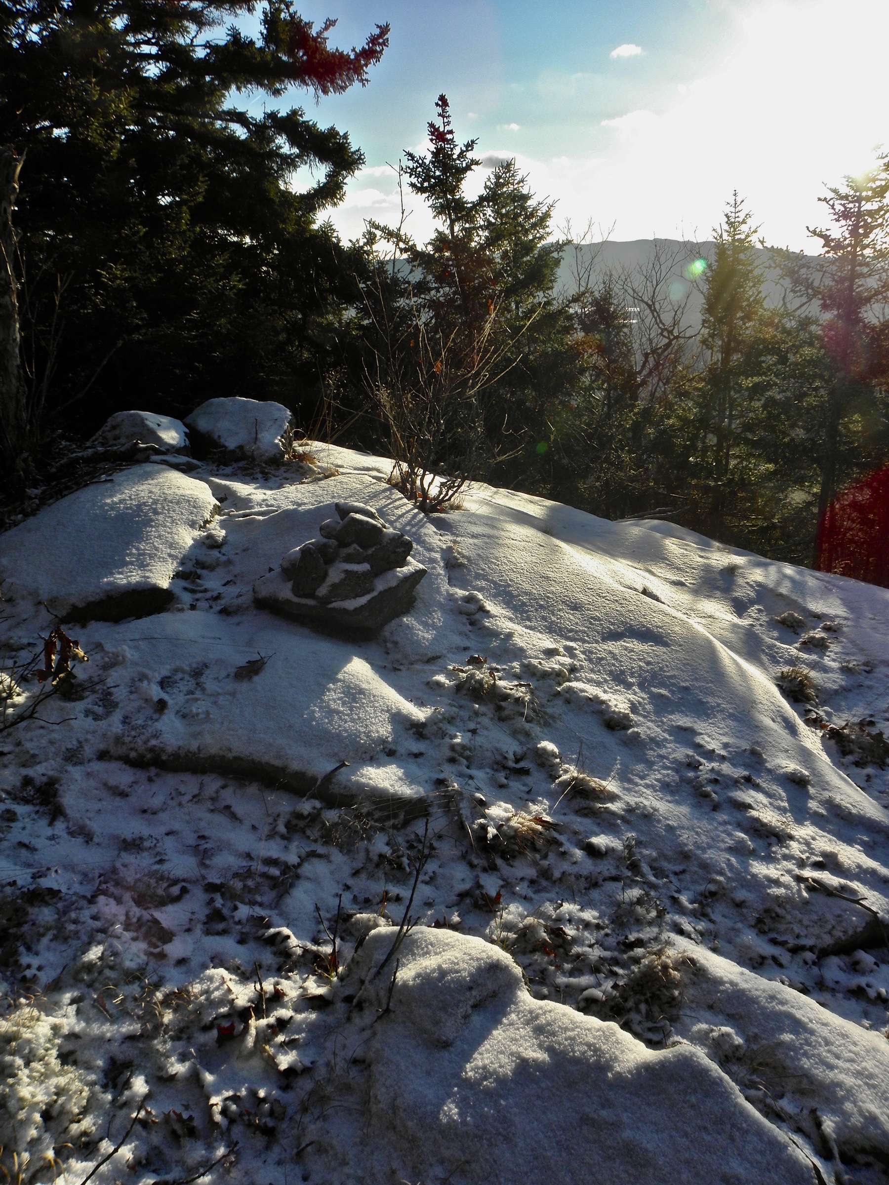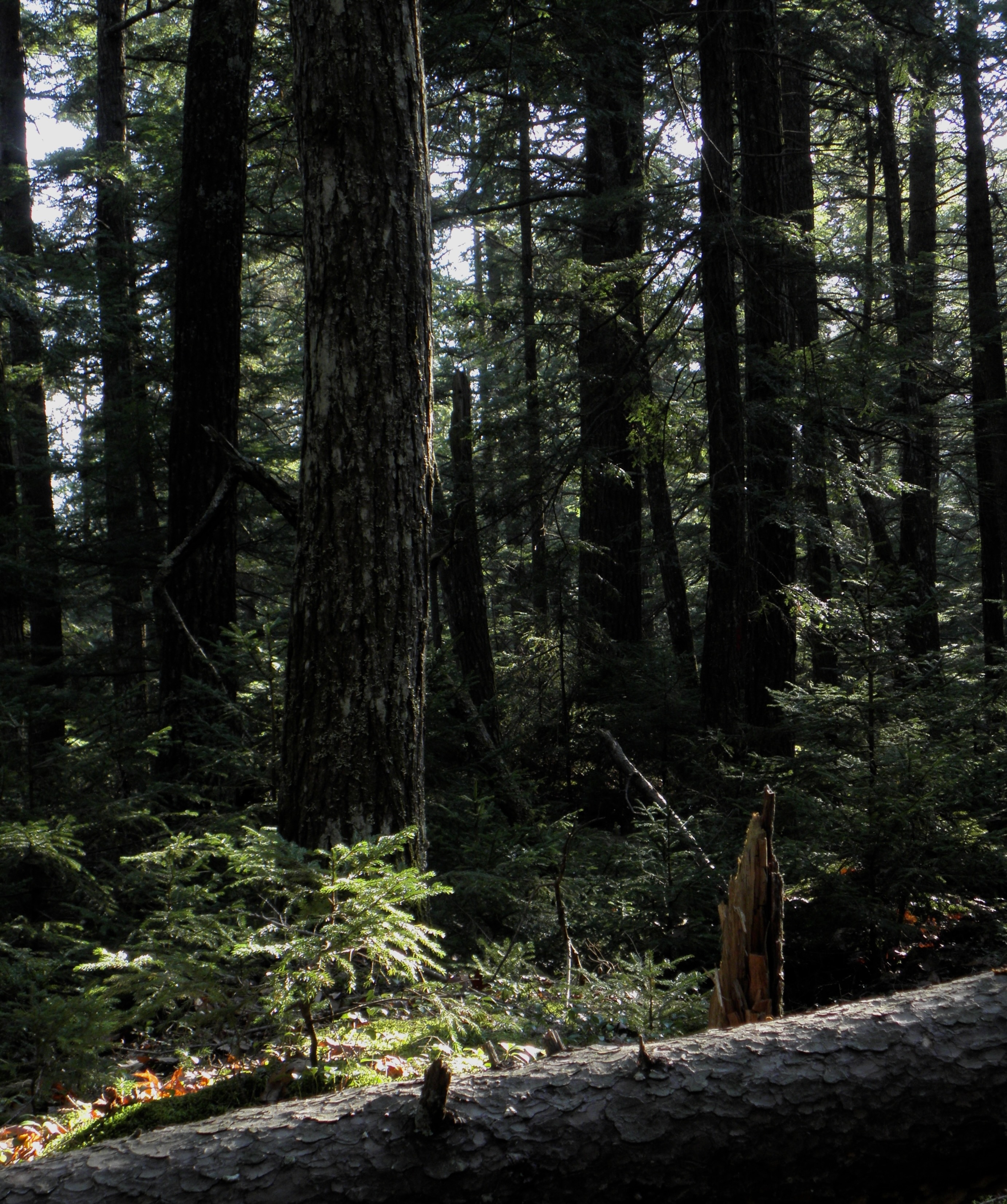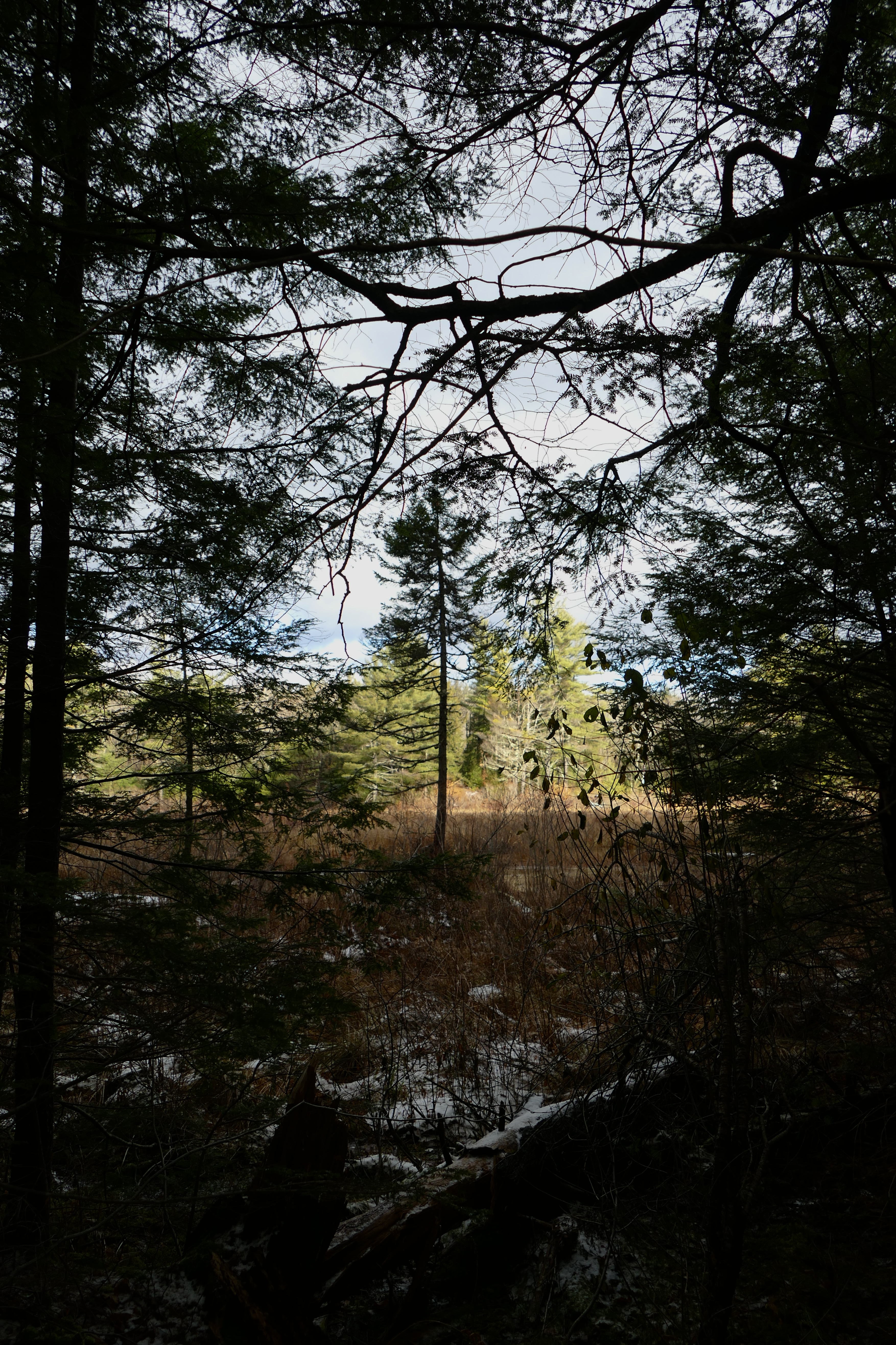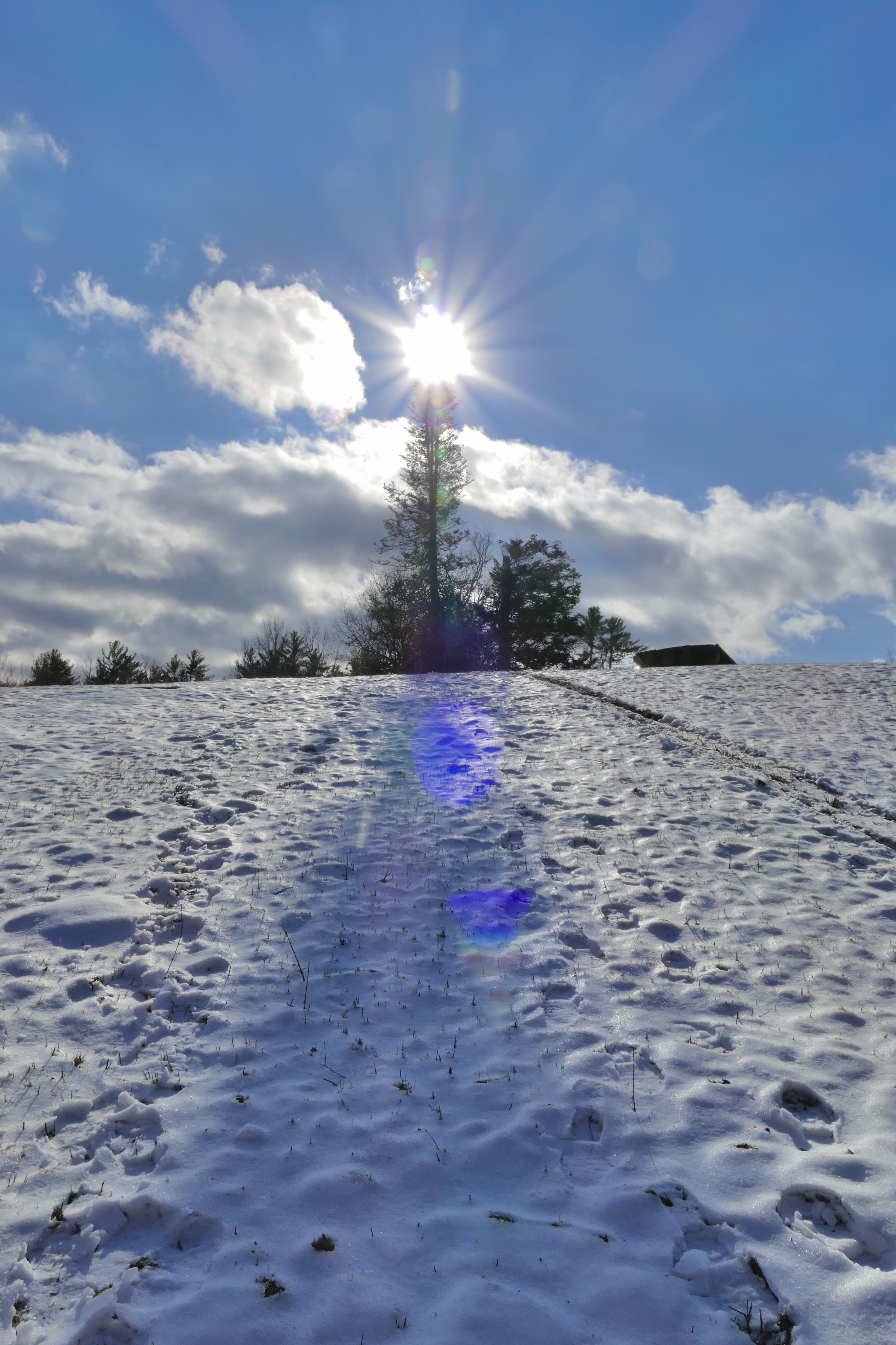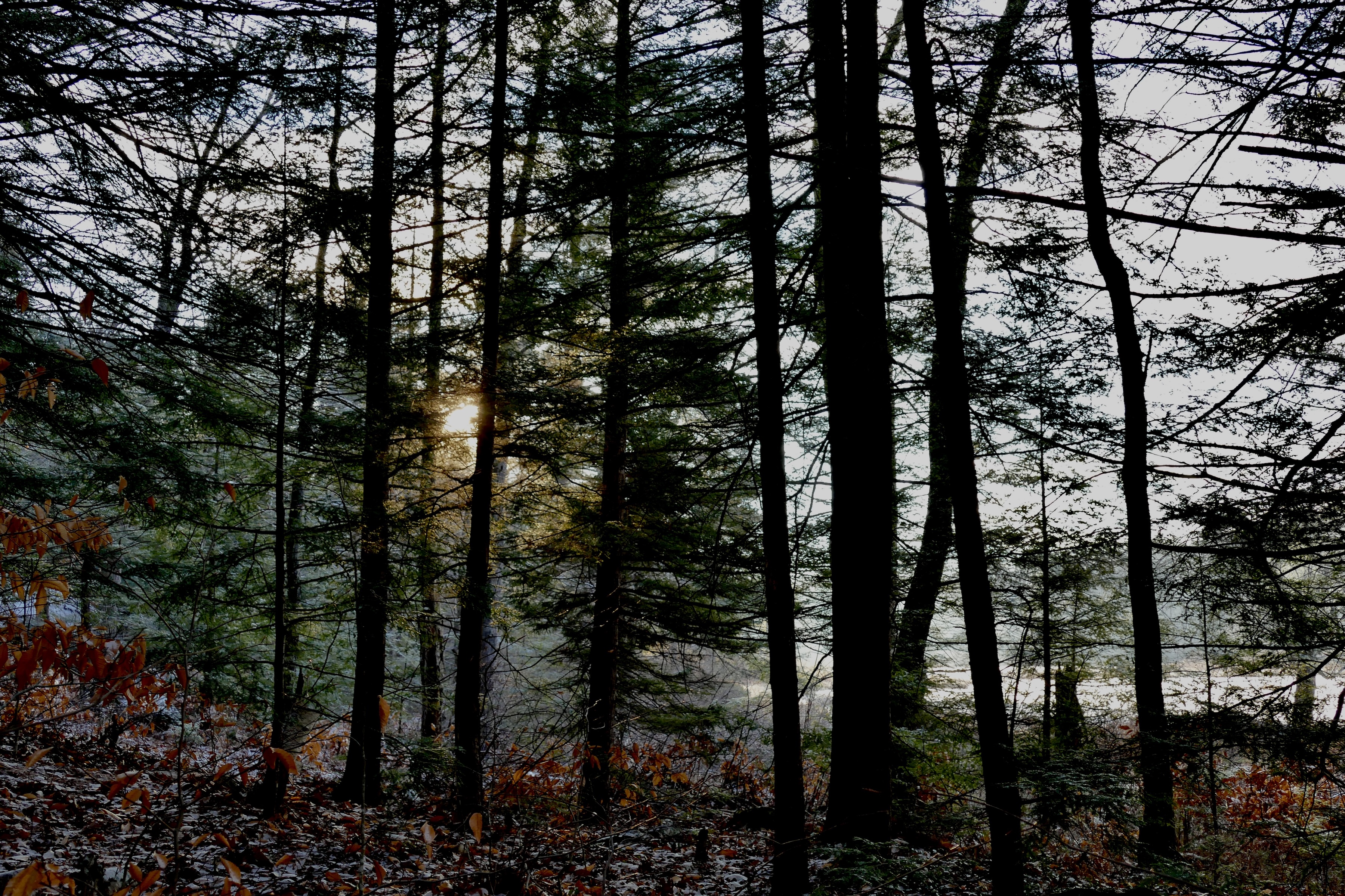 The sun seen setting through the snow-carpeted woods—with shimmering pine needles or dark green spruces & warm brown oak leaves for screens.