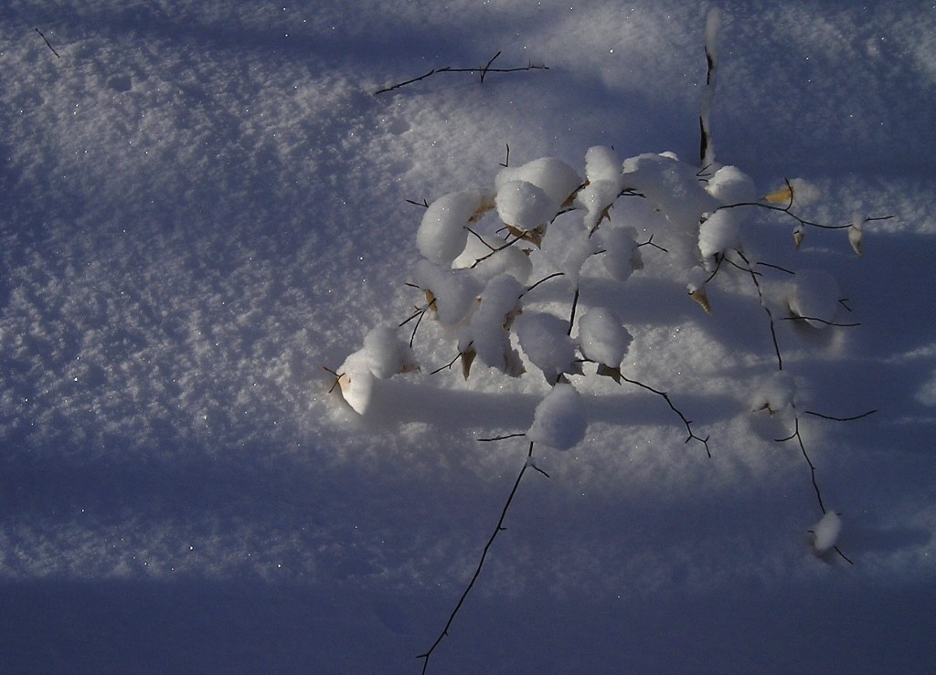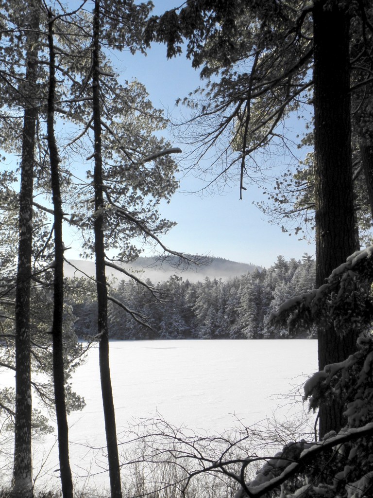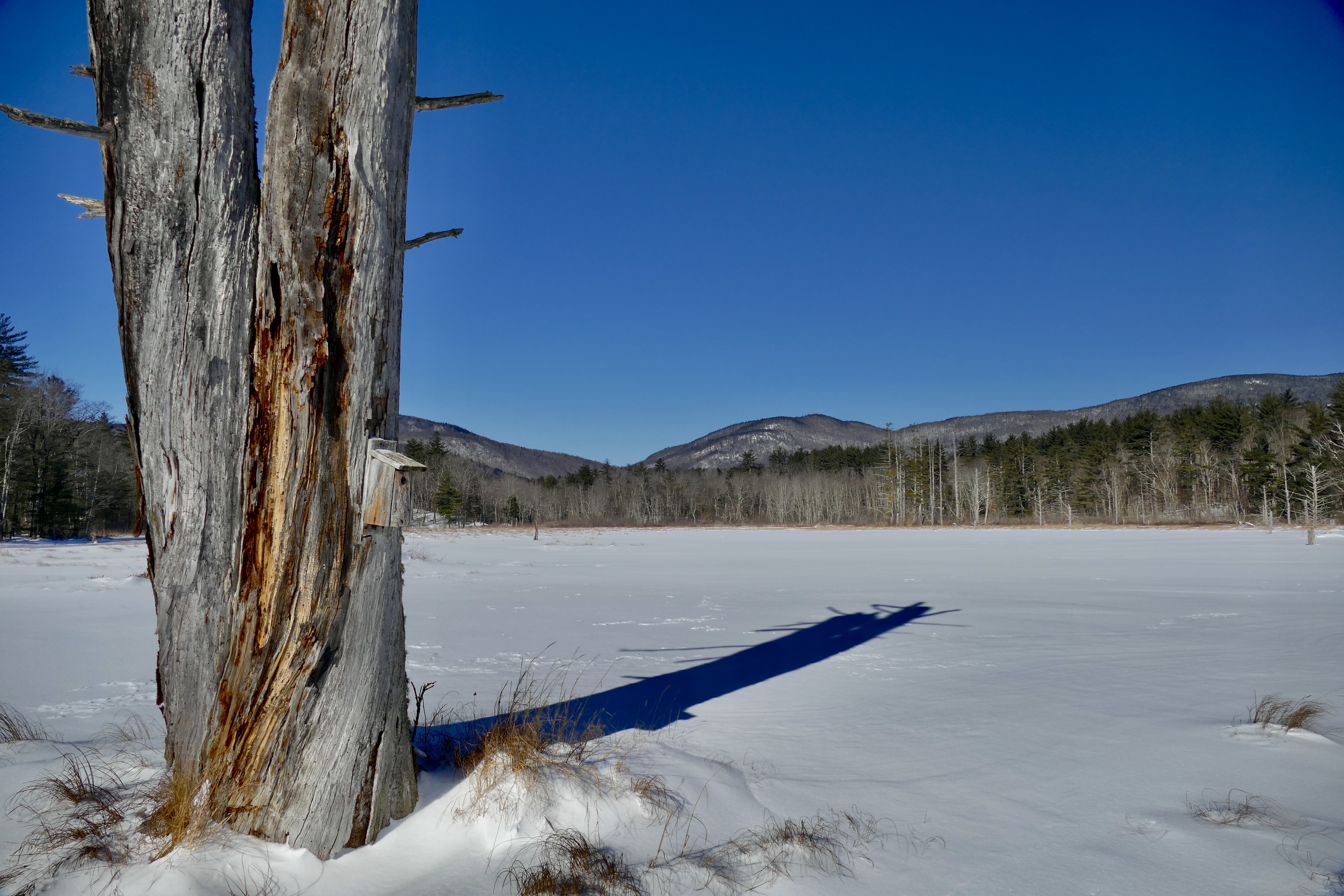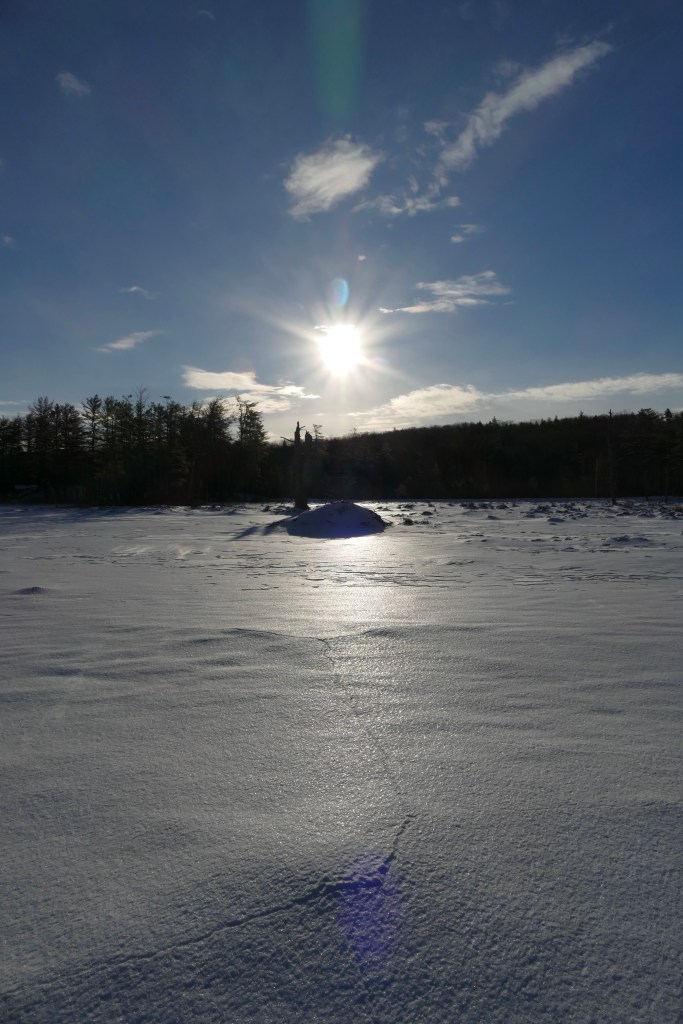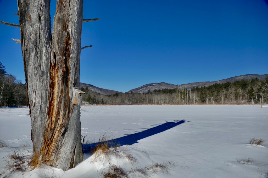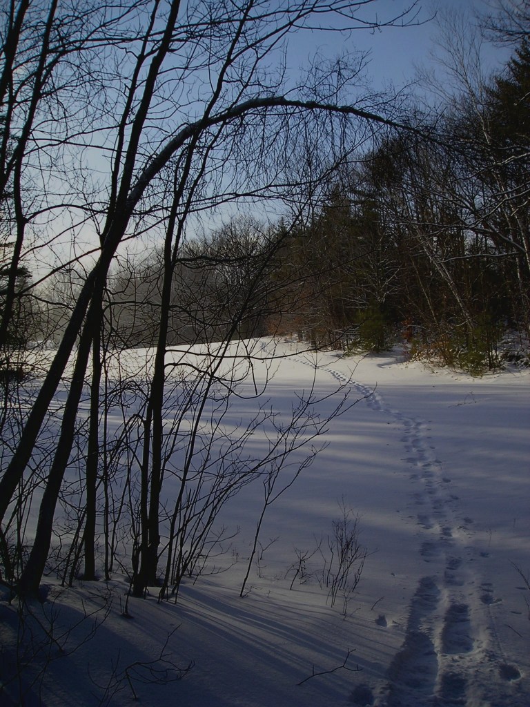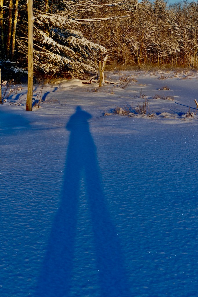 To Walden, to learn the temperature of the water….This is a very mild, melting winter day, but clear and bright. Yet I see the blue shadows on the snow at Walden. The snow lies very level there, about ten inches deep, and, for the most part, bears me as I go across with my hatchet. I think I never saw a more elysian blue than my shadow.