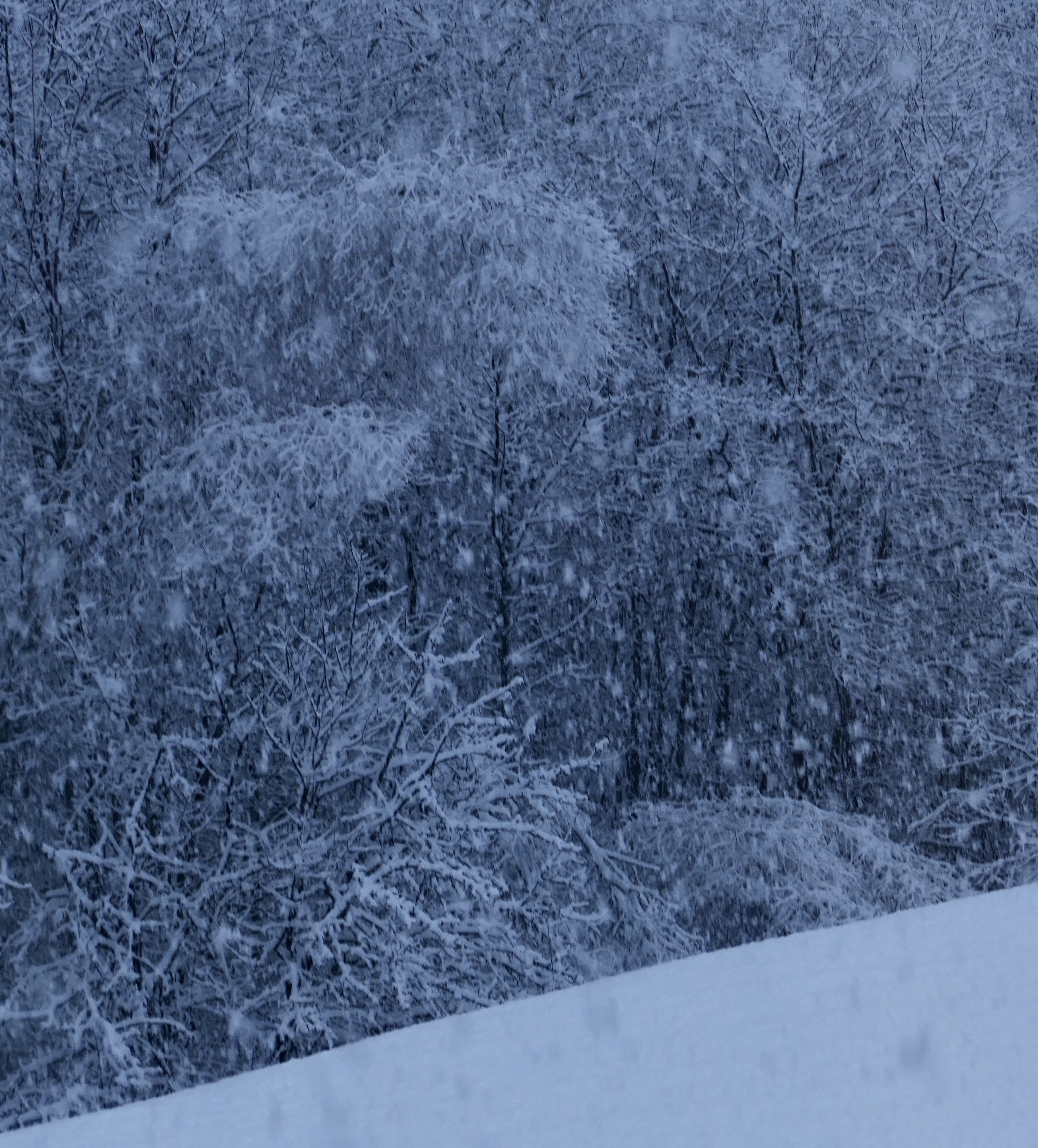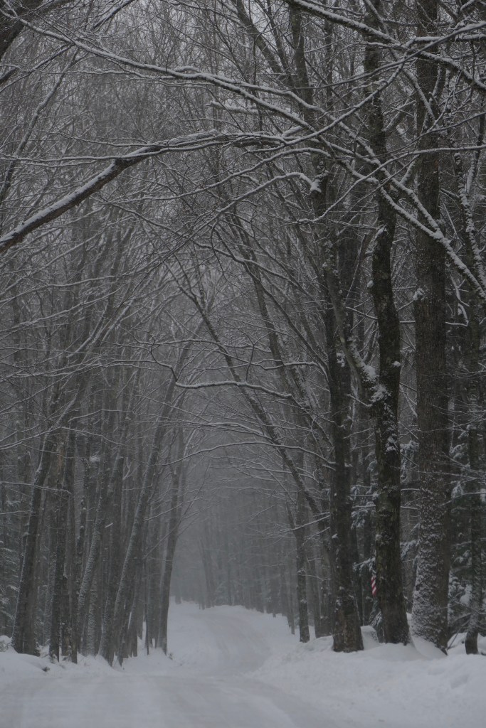 The air is thick and darkened with falling snow, and the woods are being draped with it in white wreaths. This is winter. They are putting on their white greatcoats.