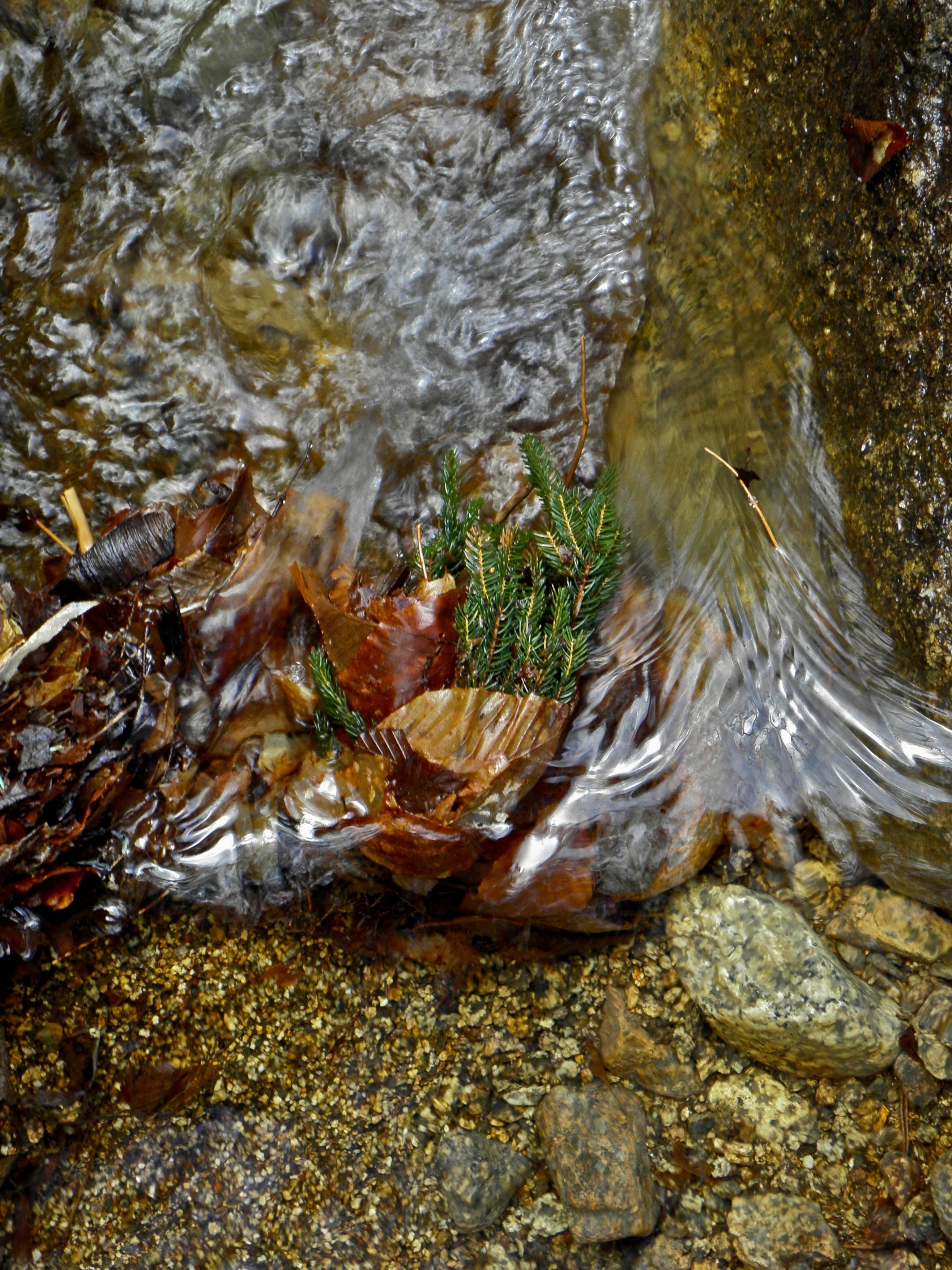 A pure brook is a very beautiful object to study minutely. It will bear the closest inspection, even to the fine air-bubbles, like minute globules of quicksilver, that lie on its bottom. The minute particles or spangles of golden mica in these sands, when the sun shines on them, remind one of the golden sands we read of. Everything is washed clean and bright, and the water is the best glass through which to see it….