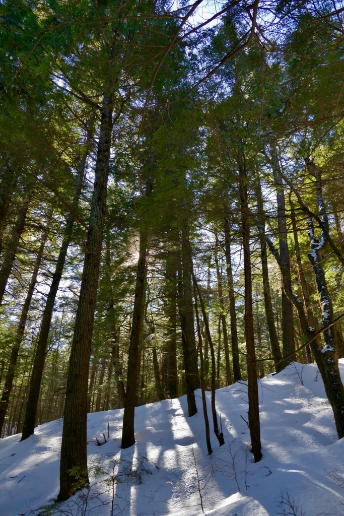 A mild, thawy day. The needles of the pine are the touch-stone for the air—any change in that element is revealed to the practiced eye by their livelier green or increased motion. They are the tell-tales. Now they are (the white pine) a cadaverous, misty blue—anon a lively silvery light plays on them —& they seem to erect themselves unusually—while the pitch pines are a brighter yellowish green than usual—The sun loves to nestle in the boughs of the pine & pass rays through them.