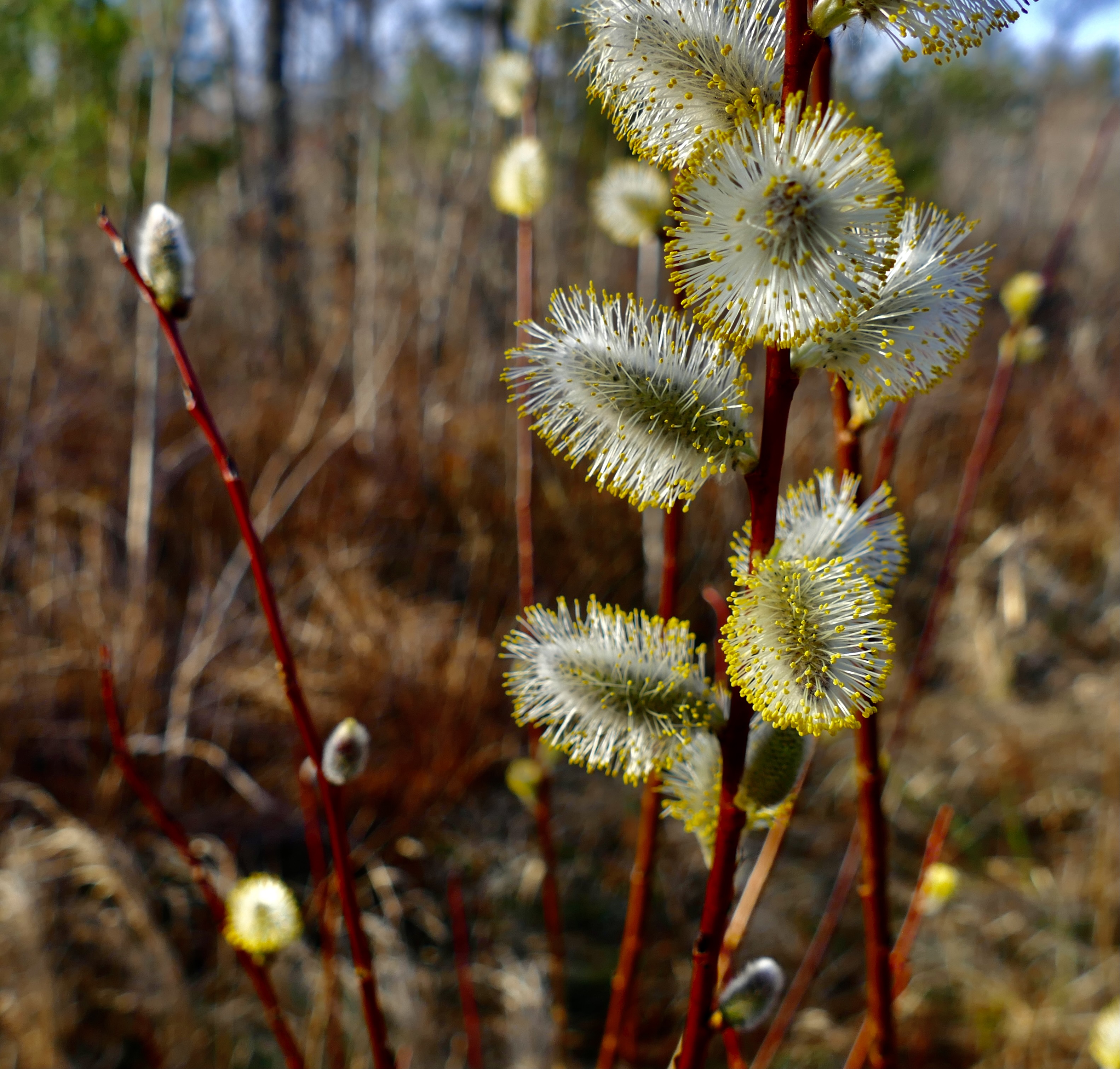 Saw the first blossoms (bright-yellow stamens or pistils) on the willow catkins to-day. The speckled alders and the maples are earlier then. The yellow blossom appears first on one side of the ament and is the most of bright and sunny color the spring has shown, the most decidedly flower-like that I have seen. It flowers, then, I should say, without regard to the skunk-cabbage, q. v. First the speckled alder, then the maple without keys, then this earliest, perhaps swamp, willow with its bright-yellow blossoms on one side of the ament.